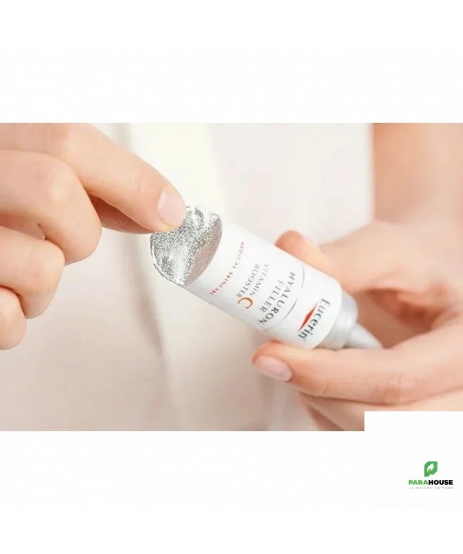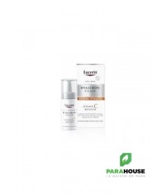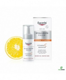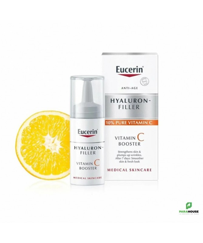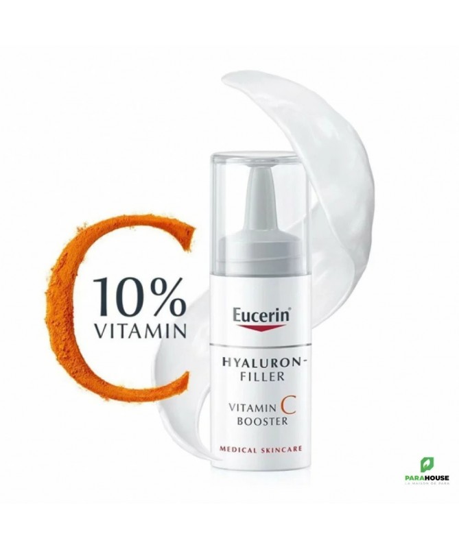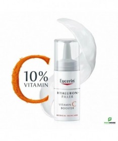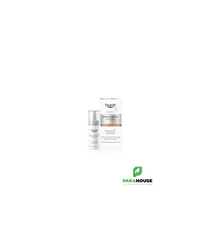 EUCERIN HYALURON-FILLER VITAMINE C BOOSTER 8ML Lissant et raffermissant, EUCERIN HYALURON FILLER VITAMINE C BOOSTER pénètre facilement. Sa formule enrichie en Vitamine C procure une sensation d'éclat à la peau. Ce soin booster renforce sans brider l'activité des cellules de l'épiderme. Ce sérum convient à tous les types de peaux et est particulièrement recommandée pour les femmes à partir de 30 ans qui désirent booster leurs défenses naturelles pour un retour à la jeunesse. Eucerin Hyaluron Filler Vitamin C Booster avec 10% de vitamine C pure fraîchement activée a été spécialement formulé pour combattre les radicaux libres et traiter les premiers signes de vieillissement : il renforce la peau, rééquilibre les inégalités du teint et aide à redonner de l'éclat aux teints secs et fatigués. Le pack innovant permet à ce que la vitamine C pure soit fraîchement activée lors de la première utilisation. Composition : V itamin C Hyaluronic Acid Licochalcone A Ingrédients : Aqua, Ascorbic-Acid, glycerine, Squalane, Isopropyl Palmitate, Dibutyl Adipate, Glyceryl Stearate, Distarch Phosphate, Methylpropanediol, Sodium Hyaluronate, Glycyrrhiza Inflata Root Extract, PEG-40 Stearate, Sorbitan Stearate, Sodium Cetearyl Sulfate, Dimethicone, Acrylic Acid-VP Crosspolymer, Xanthan Gum, Trisodium EDTA, 1-2-Hexanediol, piroctone-olamine, Phenoxyethanol, BHT, Parfum non comédogène légèrement parfumé excellente base de maquillage Conseils d'utilisation : Il est recommandé de suivre les étapes suivantes : Étape 1 : retirez la pellicule - Ôtez la pellicule de protection tout en laissant le capuchon. Étape 2 : appuyez sur le bouton souple - Appuyez 2 ou 3 fois sur le bouton souple pour libérer la vitamine C. Étape 3 : agitez pour activer la formule. Étape 4 : dévissez le capuchon Étape 5 : boostez - Retournez eucerin hyaluron filler vitamine c booster et appuyez sur le bouton souple pour libérer la formule