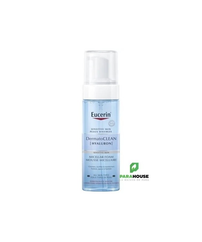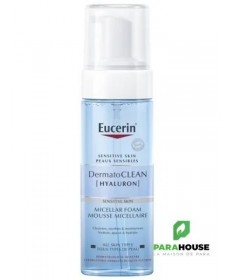 Eucerin DermatoCLEAN HYALURON Mousse Micellaire 150ML Eucerin DermatoCLEAN HYALURON Mousse Micellaire a un fort pouvoir d'élimination des impuretés et du maquillage waterproof tout en douceur et ne laisse pas une sensation de tiraillement sur votre peau. Eucerin DermatoCLEAN Mousse Micellaire est élaborée à l'aide d'actifs hautement hydratants et qui est particulièrement bénéfique pour les peaux sensibles. La Mousse Micellaire Eucerin DermatoCLEAN HYALURON élimine aussiles protections solaires pour le visage à très haute protection et résistantes à l'eau. Notre mousse nettoyante deEucerin DermatoCLEAN HYALURON est la première mousse micellaire à combiner un complexe nettoyant extra doux à de l'acide Hyaluronique et à d'autres ingrédients hydratants d'origine naturelle pour aider la peau à maintenir son équilibre hydrique naturel. Elle laisse la peau propre, hydratée, douce, matifiée et rafraîchie. Résultats : Nettoie en profondeur et efficacement : 99% Est douce pour la peau : 99% Ma peau est hydratée : 99% Laisse une sensation d'hydratation sur la peau : 99%. Rafraîchit la peau : 99% N'enlève pas l'humidité de la peau : 98% Enlève le maquillage waterproof : 98% Nettoie en douceur, apaise et démaquille en une seule étape : 98%. A une texture agréable : 100% Composition : Aqua, Poloxamer 124, glycerine, Arginine HCL, Glyceryl Glucoside, Sodium Hyaluronate, Decyl Glucoside, Sodium Cocoamphoacetate, Trisodium EDTA, Sodium Chloride, Phenoxyethanol, 1-2-Hexanediol Conseils d'utilisation : Il est conseillé de nettoyer le matin et le soir : Appuyez sur la pompe du flacon pour faire sortir la mousse dans votre main Appliquez Eucerin DermatoCLEAN Mousse Micellaire du bout des doigts sur le visage, le cou et le décolleté Vous pouvez vous mouiller le visage au préalable si vous le souhaitez Rincez votre visage à l'eau chaude