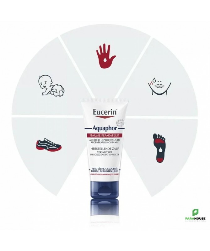 EUCERIN Aquaphor Baume Réparateur 40G EUCERIN Aquaphor Baume Réparateur apporte dès le premier contact une sensation de confort immédiat et lisse rapidement la peau. Un film protecteur doux est formé qui aide à garder la peau exempte d'irritation. Cet effet protecteur permet à l'eau et à l'oxygène de pénétrer plus profondément dans la peau, ce qui contribue à restaurer progressivement sa barrière cutanée naturelle. Le Baume Aquaphor est riche en glycérine et panthénol, il soulage la démangeaison, aide à protéger les irritations et apaise l'enflure. Baume reparateur aquaphor eucerin est apaisant et transparent et est facile à appliquer et s'applique en massant doucement sur les zones problématiques de la peau telles que les genoux et les coudes, les articulations, les cuticules et les talons craquelés. Composé de peu d'ingrédients, il est bien toléré par la peau sensible et convient aux bébés. Composition : Paraffinum Liquidum, Cera Microcristallina, Ceresin, Lanolin Alcohol, panthenol, glycerine, bisabolol sans conservateurs sans parfum non comédogène Conseils d'utilisation : Appliquer aussi souvent que nécessaire sur les zones affectées. Une noisette de produit suffit normalement pour vos deux mains. Une petite quantité du produit convient à peu près aux zones problématiques de la peau de bébé et une quantité légèrement plus grande est idéale pour chacun de vos pieds. Masser du bout des doigts sur la peau. La pommade se répand facilement lorsqu'elle se réchauffe. Ne pas utiliser sur des plaies ouvertes, saignantes ou humides. Attendre que la peau soit réépithélialisée avant d'utiliser le produit. Convient pour le corps et le visage