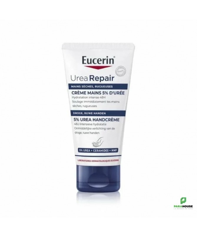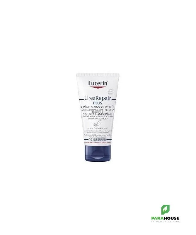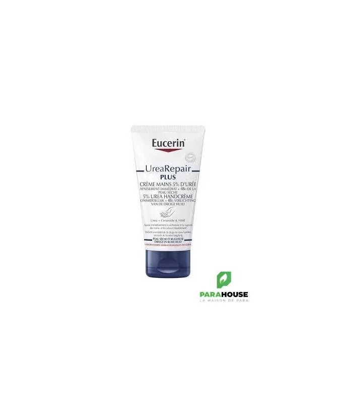 EUCERIN UreaRepair Creme Mains 5% Uree EUCERIN UreaRepair Creme Mains est une crème réparatrice et régénérante pour les mains sèches à très sèches. Elle hydrate et soulage intensément les mains sèches à très sèches pour laisser la peau douce et apaisée. La a Crème Mains UreaRepair 5% d'Urée d'EUCERIN offre aux mains sèches et rugueuses le soin quotidien dont elles ont besoin. Il contient une combinaison unique d'ingrédients – 5 % d'urée, de céramides et d'autres hydratants naturels – qui retiennent l'humidité et réparent la barrière protectrice naturelle de la peau pour éviter une perte d'hydratation supplémentaire. Il a été cliniquement et dermatologiquement prouvé que la formule procure à la fois un soulagement immédiat et une hydratation intense et durable pour les mains sèches et rugueuses. La Crème Mains UreaRepair 5% d'Urée d'EUCERIN convient à tous les types de mains sèches, y compris les peaux matures et les affections cutanées telles que la xérose, le diabète et le psoriasis. Composition : Aqua, Glycerine, Urée, Dibutyl Adipate, Glyceryl Stearate, Stearyl Alcohol, Dicaprylyl Ether, Cetearyl Alcohol, Sodium Lactate, Tapioca Starch, Glyceryl Stearate SE, Ceramide NP, Acide lactique, Arginine HCL, Sodium PCA, Cholesterol, Helianthus Annuus Seed Oil, Alanine, Carnitine, Glycine, Sodium Chloride, Dimethicone, Xanthan Gum, Sodium Cetearyl Sulfate, Decylene Glycol, Phenoxyethanol, Pentylene Glycol Conseils d'utilisation Prenez une noisette de eucerin crème main dans votre main. Massez la crème eucerin sur les mains jusqu'à absorption complète. Appliquez aussi souvent que nécessaire.