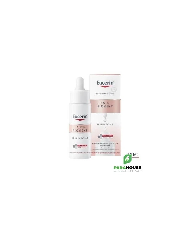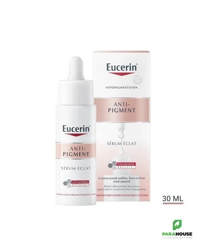 un sérum ultra léger, testé cliniquement, contient du Thiamidol pour réduire les taches brunes et prévenir leur réapparition. Adapté à tous les types de peau, ce sérum pénètre rapidement et aide la peau à paraître unifiée, lisse et d'un éclat naturel. Le Sérum Éclat ANTI-PIGMENT d'Eucerin combine des ingrédients actifs puissants qui agissent de différentes manières pour favoriser l'éclat de votre peau et réduire les taches brunes : Le Thiamidol : un ingrédient efficace et breveté qui agit à la source des taches brunes, cliniquement prouvé , il réduit et prévient l’apparition des taches brunes grâce à une utilisation régulière. L'Acide Hyaluronique : une des substances hydratantes les plus efficaces de notre peau qui l'aide à attirer et à retenir l'humidité, tandis que la glycérine est un humectant qui aide également notre peau à attirer et à retenir l'eau, offrant ainsi une hydratation et un soin durables. Ensemble, ces ingrédients permettent à votre peau de bénéficier de l'hydratation et des soins dont elle a besoin pour obtenir un bel éclat..