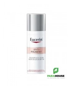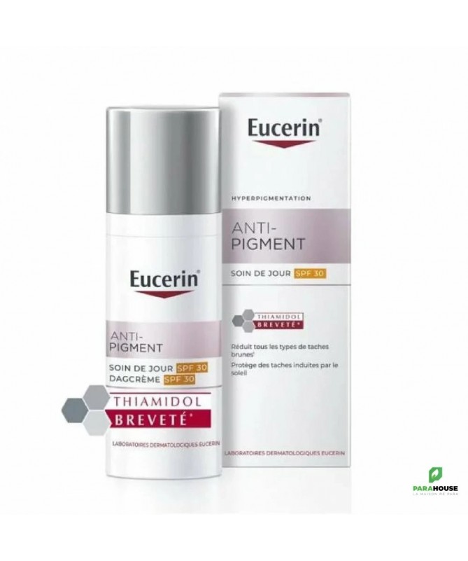 EUCERIN ANTI PIGMENT Soin de Jour SPF30 Eucerin ANTI PIGMENT Soin de Jour SPF 30 permet de r éduire efficacement les taches brunes et empêche leur réapparition Une crème de jour hydratante avec protection UVA et UVB pour une peau uniforme et éclatante. L'ANTI-PIGMENT Soin de Jour SPF 30 Eucerin contient du Thiamidol, un ingrédient efficace et breveté qui agit à la base de l'hyperpigmentation en réduisant la production de mélanine. Il est prouvé par des études cliniques et dermatologiques qu'il réduit les taches brunes et empêche leur réapparition. Les premiers résultats sont visibles après deux semaines et s'améliorent continuellement avec une utilisation régulière. Avec les filtres UVA et UVB (SPF 30), EUCERIN ANTI-PIGMENT Soin de Jour protège efficacement du soleil et réduit les risques de formation de taches pigmentaires induites par la peau. La peau paraît uniforme et éclatante Convient aux peaux normales à sèches. Composition : Aqua, Alcohol Denat, Glycerine, Butyl Methoxydibenzoylmethane, Butylene Glycol Dicaprylate/Dicaprate, C12-15 Alkyl Benzoate, Dibutyl Adipate, Bis-Ethylhexyloxyphenol Methoxyphenyl Triazine, Ethylhexyl Triazone, Phenylbenzimidazole Sulfonic Acid, Cetyl Alcohol, Diethylamino Hydroxybenzoyl Hexyl Benzoate, Distarch Phosphate, Tapioca Starch, Isobutylamido Thiazolyl Resorcinol, Glycyrrhiza Inflata Root Extract, Tocopherol, Glyceryl Stearate, Carrageenan, Xanthan Gum, Hydroxypropyl Methylcellulose, Sodium Stearoyl Glutamate, Sodium Hydroxide, Sodium Chloride, Ethylhexylglycerin, Caprylyl Glycol, Trisodium Ethylenediamine Disuccinate, Phenoxyethanol, Parfum Conseils d'Utilisation : Il est recommandé d'Appliquer Eucerin Anti Pigment soin de jour en petite quantité sur le visage, le cou et le décolleté (poitrine). Masser eucerin anti tache délicatement en évitant tout contact avec les yeux.