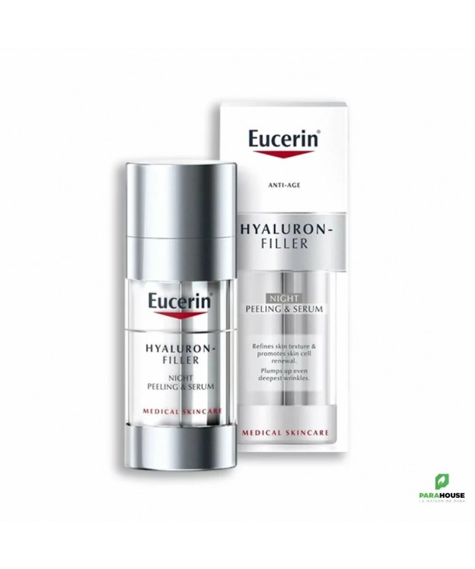 EUCERIN HYALURON-FILLER PEELING & SÉRUM NUIT Eucerin Hyaluron-Filler Peeling & Sérum Nuit combine deux formules puissantes pour de multiples bénéfices anti-âge La double efficacité d'un peeling anti-âge et d'un sérum qui exfolie et affine la texture de la peau, favorise le renouvellement cellulaire et comble les rides, même les plus profondes. La peau est plus lumineuse et plus lisse. Eucerin Hyaluron-Filler Peeling & Sérum Nuit combine deux formules puissantes pour de multiples bénéfices anti-âge : Une peau lissée et lumineuse : L'émulsion crémeuse contient un complexe AHA (alpha-hydroxy-acide) efficace et de la Glycine Saponine. Les AHA, dont beaucoup sont connus sous le nom d'acides de fruits, exfolient la peau tandis que la Glycine Saponine favorise la production d'Acide Hyaluronique dans les cellules épidermiques où naissent les rides profondes. Hydratation et comblement des rides: Le gel transparent associe l'Acide Hyaluronique concentré de haut et de bas poids moléculaire. L'Acide Hyaluronique de haut poids moléculaire aide à lisser les couches supérieures de l'épiderme tandis que l'Acide Hyaluronique de bas poids moléculaire (qui est 40 fois plus petit) pénètre plus profondément dans les couches de l'épiderme où naissent les rides plus profondes. Les deux formules se mélangent sur votre peau pour lui donner une sensation de douceur. Ce produit innovant est conçu pour être utilisé pendant la nuit. Il est cliniquement et dermatologiquement prouvé qu'une utilisation régulière d'Eucerin Hyaluron-Filler Peeling & Sérum Nuit affine la texture de la peau et favorise le renouvellement cellulaire tout en comblant les rides, même profondes. La peau est plus lisse, plus lumineuse et les pores sont resserés. Composition: Aqua Glycerin ALCOHOL-DENAT Glycolic Acid Dimethicone Tapioca Starch Cetearyl Alcohol Glyceryl Stearate Distarch Phosphate PEG-40 Stearate Sodium Hyaluronate Glycine Soja Germ Extract Gluconolactone Panthenol Lactate (acide lactique) PEG-150 Distearate Carbomer Xanthan Gum Sodium Hydroxide Trisodium EDTA Phenoxyethanol Parfum Conseils d'Utilisation: Il est recommandé d'Appliquer une fois par jour, le soir, sur le visage, le cou et le décolleté bien nettoyés Appuyer sur le haut du flacon, au centre de la pompe pour libérer la combinaison optimale des deux formules Mélanger les deux formules dans la paume de votre main Éviter le contact direct avec vos yeux Le produit peut augmenter la sensibilité de la peau au soleil, assurez-vous d'utiliser une crème SPF 30 minimum chaque jour après l'utilisation du produit et pendant une semaine après l'utilisation. Pour de meilleurs résultats, utiliser en association avec d'autres produits de la gamme Eucerin Hyaluron-Filler