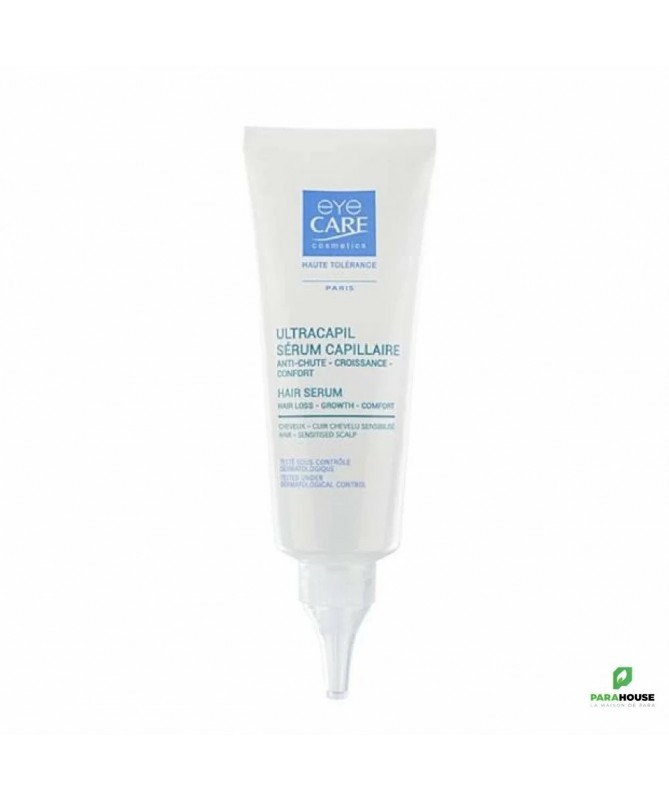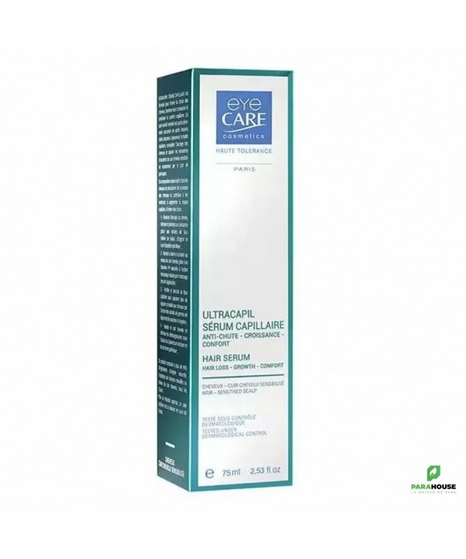 EYE CARE ULTRACAPIL SERUM CAPILAIRE ANTI CHUTE 75ML EYE CARE ULTRACAPIL SERUM est un soin nutritif intensif particulièrement concentré en actifs naturels ciblés, pour dynamiser le bulbe capillaire et améliorer l’ancrage des cheveux tout en apaisant les sensations d’inconfort du cuir chevelu. Ce Soin de cheveux est destiné aux personnes souffrant de chute de cheveux et/ou de perte de densité capillaire notamment liées à des causes hormonales (suite de grossesse, ménopause…), liées à la saisonnalité, mais également liées à des traitements médicamenteux dont des personnes en cours de traitement chimiothérapique et dans le cas d’alopécie androgénique. Il contribue à freiner la chute des cheveux, les renforcer, et densifier la chevelure et agit à tous les niveaux du mécanisme de la pousse des cheveux. Ses actifs naturels spécifiques (Scutellaire de Baïkal, extrait d’oignon, Niacinamide, germes de blé et soja) participent à la régulation de la chute, apportent vigueur et vitalité pour augmenter la masse capillaire et renforcer la fibre capillaire. Le cuir chevelu est apaisé et le cheveu est fortifié, mieux ancré et plus dense. Formulé avec de l'extrait de Cynanchum, ULTRACAPIL SERUM CAPILAIRE apaise le cuir chevelu , et diminue les démangeaisons, liées à un cuir chevelu irrité ou au port de perruques. Ralentit la chute du cheveu Réactive la pousse Favorise la croissance Favorise la fortification Possède une action apaisante, anti-démangeaison du cuir chevelu notamment dans le cadre du port de perruques. Composition : Aqua (Water), Glycerin, Niacinamide, Propanediol, Butylene Glycol, Phenethyl Alcohol, Polyacrylate Crosspolymer-6, Sodium Phosphate, Arginine, Lactic Acid, Allium Cepa Bulb Extract, Glycine Soja Germ Extract, Triticum Vulgare Germ Extract, Disodium Phosphate, Gluconolactone, Sodium Benzoate, Scutellaria Baicalensis Root Extract, Potassium Sorbate, Cynanchum Atratum Extract, Panthenol, Calcium Gluconate, Biotinoyl Tripeptide-1 (LRC01/1) 90% d’ingrédients d’origine naturelle Conseils d'utilisation : Appliquer 2 à 3 fois par semaine, raie par raie sur cuir chevelu propre et encore humide à l’aide de l’embout précision. Masser par mouvements circulaires jusqu’à pénétration complète. Ne pas rincer. Laisser sécher. Une fois sec le cheveu peut avoir tendance à "cartonner" légèrement. Brosser jusqu'à ce que le cheveu retrouve sa souplesse. Pour un résultat optimal, ce soin capillaire est à réaliser en cure de 3 mois.