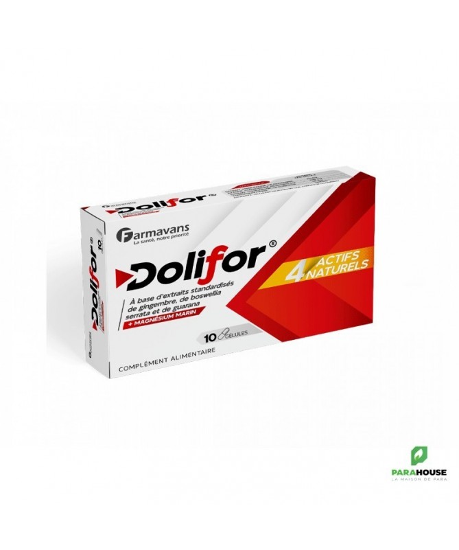 Description :Dans quels cas utiliser ce produitDOLIFOR est un complément alimentaire qui contient des extraits standardisés de gingembre, de boswellia serrata et de guarana.DOLIFOR contient aussi du magnésium qui contribue au fonctionnement normal du système nerveux et des muscles, à l’équilibre électrolytique du corps et au maintien de la santé des os et des dents.Comment utiliser ce produit :Posologie : Une gélule trois fois par jourComposition par gélule :Extrait sec de Zingiber Officinalestandardisé à 5% de gingérol……….50 mgExtrait de Boswellia serrata standardiséä 65% d’acides boswelliques….100 mgExtrait sec de guarana standardiséà 22 % de caféine naturelle………50 mgExtrait minéral marin naturel (103 mg) fournissantune quantité de magnésiumélément équivalente à ….56.65 mgExcipients : Cellulose microcristalline,stéarate de Magnésium.Gélule: Dioxide de titane (E171), Oxyde de fer jaune (E172)Gélatine bovine halal.