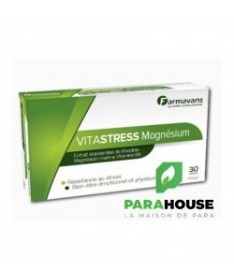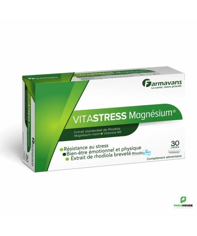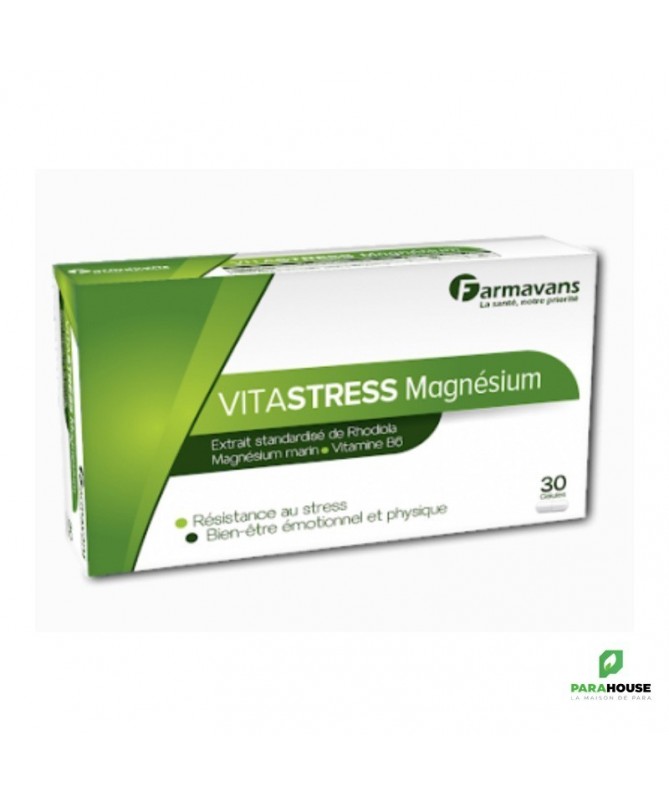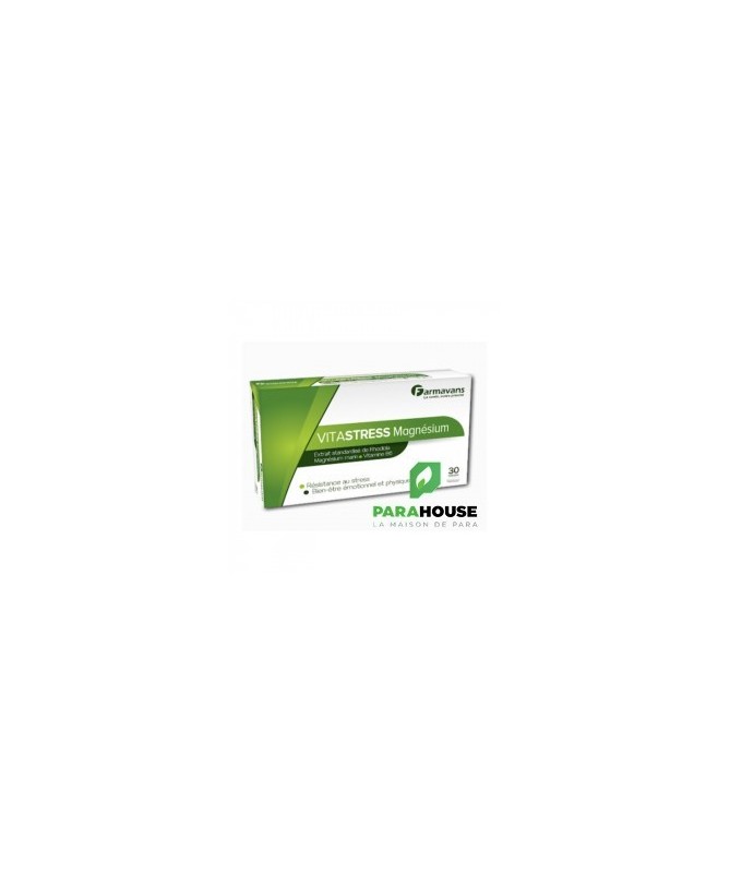 FARMAVANS VITASTRESS MAGNESIUM 30 Gelules FARMAVANS VITASTRESS MAGNESIUM est un complement alimentaire qui associe l’extrait breveté de Rhodiola rosea (Rhodiozen®), actif 100 % d’origine végétale pour aider l’organisme à s’adapter pour améliorer sa résistance au stress, de Magnésium marin (Simag™) et de vitamine B6 pour aider à réduire la fatigue. Composition : Extrait sec de Rhodiola Rosea L. standardisé à 3% de rosavine et 1% de salidroside (breveté Rhodiozen® (100 mg), Simag™, extrait minéral marin naturel purifié (300 mg) fournissant une quantité de magnésium élément équivalente à 165 mg, Vitamine B6 (2 mg). Excipients: Cellulose microcristalline, stéarate de Magnésium, talc. Conseils d'utilisation : Prendre Une à deux gélules de VITASTRESS MAGNESIUM le matin.