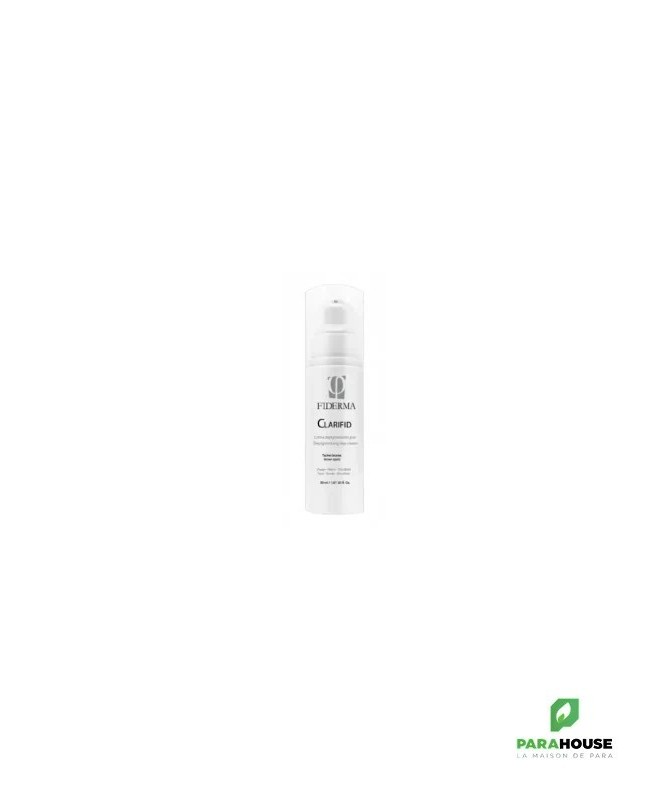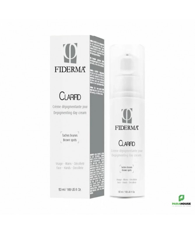 FIDERMA CLARIFID CREME DEPIGMENTANTE JOUR 50ML FIDERMA CLARIFID CREME DEPIGMENTANTE JOUR a été spécifiquement conçue pour le traitement des hyperpigmentations cutanées. Sa formule réduit les taches brunes existantes et prévient la formation de nouvelles hyperpigmentations. Conseil d'utilisation : appliquer CLARIFID Crème de jour dépigmentante une fois par jour, le matin, sur les zones concernées.