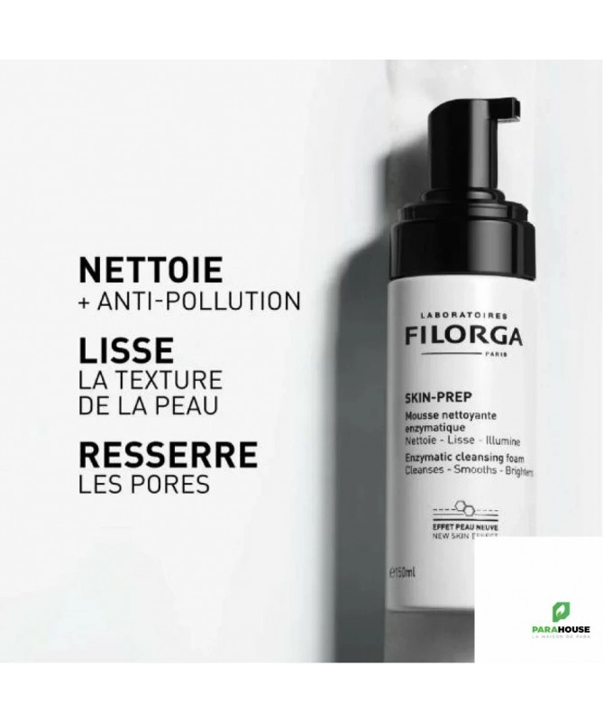 FILORGA SKIN PREP Mousse Nettoyante Enzymatique 150ML FILORGA SKIN PREP Mousse Nettoyante Enzymatique est le nettoyant visage effet peau neuve élimine maquillage et particules de pollution, favorise le renouvellement cellulaire, resserre les pores et unifie le grain de peau. Sa formule resurfaçante s’inspire des techniques de nettoyage utilisées en cabinet esthétique, booste le processus naturel d’élimination des cellules mortes grâce une enzyme de papaïne stabilisée. Pour une peau lissée et un teint lumineux. FILORGA SKIN PREP Mousse Nettoyante est conçue pour toutes les peaux et notamment pour les peaux et les yeux sensibles. Dès la première utilisation, 100% des femmes disent leur peau parfaitement nettoyée et 94% d’entre elles trouvent leur teint plus frais. Après 7 jours d’utilisation, 94% des femmes trouvent leur peau clarifiée, et 91% leur grain de peau lissé. Formulé avec 98% d’ingrédients d’origine naturelle. Sans sulfates. Testé sur peaux sensibles. Composition : AQUA (WATER, EAU), GLYCERIN, DECYL GLUCOSIDE, DISODIUM COCOYL GLUTAMATE,CAPRYLYL/CAPRYL GLUCOSIDE, SODIUM CHLORIDE, PROPANEDIOL, 1,2-HEXANEDIOL, CITRIC ACID, HYDROXYACETOPHENONE, CAPRYLYL GLYCOL, SODIUM COCOYL ALANINATE, PARFUM (FRAGRANCE), SODIUM BENZOATE, PAPAIN, CARBOMER, SODIUM HYALURONATE, ALGIN. Conseils d'utilisation : FILORGA SKIN-PREP Mousse Nettoyante s’utilise en deuxième étape de la routine de nettoyage Skin Prep, après l’huile démaquillante perfectrice ou la solution micellaire et avant la crème exfoliante. Appliquer le produit sur peau humide, masser pendant 30 secondes puis rincer. Conçue pour toutes les peaux et notamment pour les peaux et les yeux sensibles.