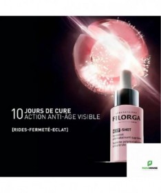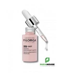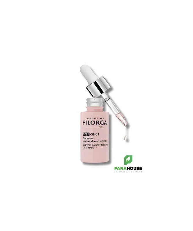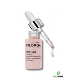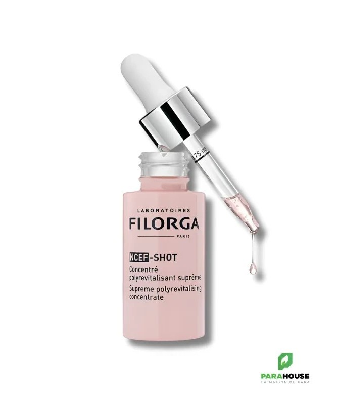 FILORGA NCEF SHOT Concentré Polyrevitalisant Suprême 15ML FILORGA NCEF SHOT Concentré Polyrevitalisant Suprême est un soin anti-âge et anti-rides qui réduit visiblement les rides pour une peau ferme et éclatante. NCEF SHOT FILORGA est equivalant à 1 méso-injection concentrée dans une cure régénérante intensive pour améliorer la qualité de peau et booster la correction des signes du vieillissement en 10 jours. FILORGA NCEF SHOT est une formule concentree de NCEF permettant l'a ctivation cellulaire [correction rides + fermeté + éclat] : Un puissant complexe issu des biotechnologies active de nouvelles cellules pour une correction boostée des signes du vieillissement. Idéal lors des changements de saisons, des périodes de stress ou de fatigue avec une textur ultra-legère. 90% Peau plus lisse 90% peau plus ferme 87% peau plus lumineuse Composition : AQUA WATER, EAU , GLYCERETH 26, GLYCERIN, METHYLPROPANEDIOL, PENTYLENE GLYCOL, SODIUM CHLORIDE, PPG 26 BUTETH 26, PEG 40 HYDROGENATED CASTOR OIL, PHENOXYETHANOL, PARFUM FRAGRANCE , SODIUM HYALURONATE, PROPANEDIOL, SUCROSE PALMITATE, GLUCOSE, XANTHAN GUM, TOCOPHERYL ACETATE, DISODIUM EDTA, OCTADECYL DI T BUTYL 4 HYDROXYHYDROCINNAMATE, POTASSIUM CHLORIDE, GLYCERYL LINOLEATE, PRUNUS AMYGDALUS DULCIS SWEET ALMOND OIL, CALCIUM CHLORIDE, ADENOSINE, MAGNESIUM SULFATE, GLUTAMINE, SODIUM HYDROXIDE, SODIUM PHOSPHATE, ASCORBIC ACID, SODIUM ACETATE, GLYCERYL CAPRYLATE, LYSINE HCL, ARGININE HCL, ALANINE, HISTIDINE HCL, VALINE, LEUCINE, THREONINE, CITRIC ACID, ISOLEUCINE, TRYPTOPHAN, PHENYLALANINE, TYROSINE, GLYCINE, POLYSORBATE 80, POTASSIUM SORBATE, SERINE, CYSTINE, CYANOCOBALAMIN, GLUTATHIONE, ASPARAGINE, ASPARTIC ACID, PSEUDOALTEROMONAS FERMENT EXTRACT, ORNITHINE HCL, GLUTAMIC ACID, NICOTINAMIDE ADENINE DINUCLEOTIDE, PROLINE, METHIONINE, TAURINE, HYDROXYPROLINE, GLUCOSAMINE HCL, COENZYME A, TOCOPHEROL, SODIUM GLUCURONATE, THIAMINE DIPHOSPHATE, RETINYL ACETATE, INOSITOL, NIACIN, NIACINAMIDE , PYRIDOXINE HCL, BIOTIN, CALCIUM PANTOTHENATE, RIBOFLAVIN, SODIUM TOCOPHERYL PHOSPHATE, THIAMINE HCL, FOLIC ACID Testé sous contrôle dermatologique Conseils d'utilisation : Appliquer matin et soir pendant 10 jours sur l’ensemble du visage, du cou et du décolleté, sous le sérum ou sous le soin. A l’aide de la pipette, prélever le produit jusqu’au trait. Chauffer le produit dans le dans le creux des mains puis appliquer en lissage. Bien agiter avant utilisation NCEF SHOT peut être utilisé toute l’année, été inclus. Sa formule ne présente aucune substance connue pour être photosensibilisante. Nous vous recommandons d’utiliser une protection UV (UV-DEFENCE, UV-BRONZE) pour compléter votre routine soin, notamment pendant cette période estival Idéal pour tous les types de peaux.