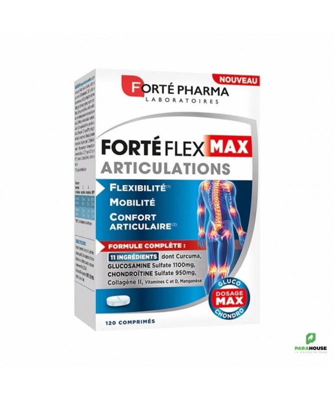 FORTE PHARMA FORTE FLEX MAX ARTICULATIONS 120CPS FORTE PHARMA FORTE FLEX MAX ARTICULATIONS aide à maintenir le confort et la souplesse de vos articulations grâce à son dosage fort en Glucosamine sulfate et en Chondroïtine sulfate. FORTE PHARMA ARTICULATIONS associe des composants essentiels du cartilage (glucosamine et chondroïtine), à un composé soufré, du collagène II, un trio de plantes et des vitamines et minéraux. Très complète, la formule réunit 11 ingrédients dont le Curcuma pour vous aider à retrouver votre mobilité : du curcuma, qui contribue à la souplesse et au confort articulaire un fort dosage en glucosamine et en chondroïtine. Ils sont produits naturellement par votre organisme pour constituer le cartilage. Nous les avons associés à un composé soufré : le MSM (Méthyl-Sulfonyl-Méthane) du collagène de type II. Il s'agit de la protéine principale qui constitue le cartilage articulaire des plantes telles que l'Harpagophytum et l'Ashwagandha de la vitamine C qui contribue à la formation normale de collagène pour assurer la fonction normale des cartilages et de la vitamine D qui contribue au maintien d’une ossature normale et d’une fonction musculaire normale des minéraux, le Manganèse et le Sélénium, qui contribuent à protéger les cellules contre le stress oxydatif Composition : Ingrédients par dose journalière : agent de charge (cellulose microcristalline), sulfate de glucosamine 2KCl (crustacés) (1100mg), sulfate de chondroïtine sodique (950mg), méthylsulfonylméthane (200mg), agents d’enrobage (hydroxypropylméthylcellulose, hydroxypropylcellulose, amidon modifié, talc, acide stéarique), poudre de curcuma (Curcuma longa L.) (100 mg), vitamine C (acide L-ascorbique), extrait d’Ashwagandha (Withania somnifera (L.) Dunal) (50 mg soit 500 mg en EPS*), antiagglomérant (sels de magnésium d’acides gras), gluconate de manganèse, collagène de type II (10) (hydrolysé), extrait d’Harpagophytum (Harpagophytum procumbens (Burch.) DC.) (7,5 mg soit 150 mg en EPS*), vitamine D3 (cholécalciférol), sélénite de sodium. Conseils d'utilisation : Prendre 2 comprimés de FORTE FLEX MAX 2 fois par jour matin et soir , les premières semaines, puis 2 à 4 comprimés en fonction des besoins. 1 à 3 mois. Ne pas dépasser la dose journalière conseillée. Tenir hors de la portée des jeunes enfants. Déconseillé aux femmes enceintes ou qui allaitent et aux enfants de moins de 15 ans sans avis médical. Contient de la glucosamine, de la chondroïtine, du curcuma, déconseillés aux personnes diabétiques, prédiabétiques, asthmatiques et sous anticoagulants. Contient de l’harpagophytum, ne pas utiliser en cas d'ulcère gastrique ou duodénal ou de calculs biliaires. A conserver à une température inférieure à 25°C et à l’abri de l’humidité dans son emballage hermétiquement fermé.