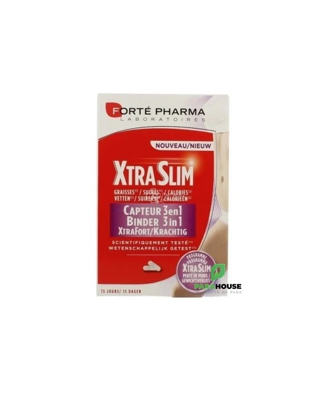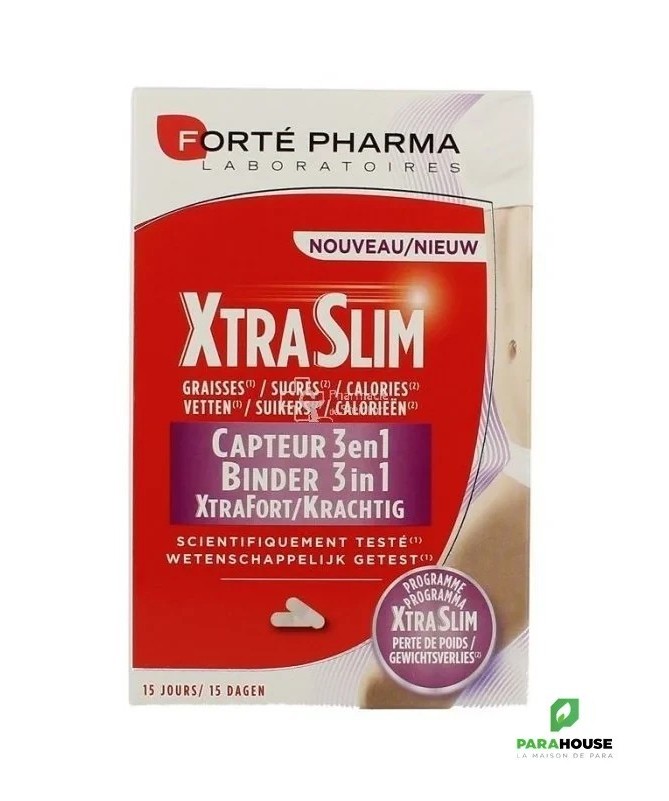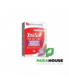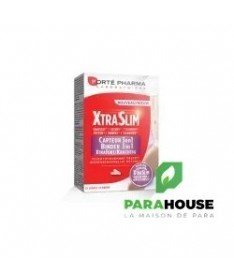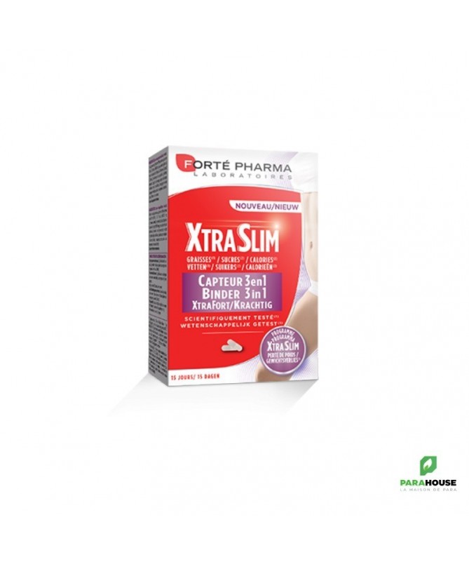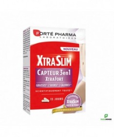 FORTE PHARMA XTRASLIM CAPTEUR 3 EN 1 60gélules FORTE PHARMA XTRASLIM CAPTEUR 3 EN 1 est une formule triple action qui vous aidera à perdre du poids et capter les graisses efficacement. XTRASLIM CAPTEUR 3 EN 1 est idéal pour un programme perte de poids complet ou pour une prise ponctuelle. XtraSlim Capteur 3 en 1 agit de manière polyvalente pour vous aider à : Capter une partie des graisses ingérées lors des repas grâce à LipoCapt : un actif naturel à base de fibres naturelles de polysaccharides de champignons. Bloquer les sucres grâce à une plante unique, le Gymnema Sylvestris : il agit en bloquant les sucres et en diminuant l’envie d’aliments sucrés. Le Chrome vient renforcer l’action du Gymnema en maintenant une glycémie normale. Réduire les calories avec le LipoCapt et le Gymnema Sylvestris : ils permettent de réduire l’apport calorique et contribuent à perdre du poids. Le Gymnema Sylvestris bloque les sucres et diminue l’envie de sucré. Il aide à la perte de poids en réduisant l’apport calorique et l’appétit. Composition : extrait de Gymnema sylvestre (Marsdenia sylvestris (Retz.) P.I. Forst.) (6000 mg équivalent plantes), complexe LipoCapt (Agaricus bisporus (Lange)) (400 mg), enveloppe de la gélule (gélatine, colorant : oxyde de fer rouge), agent de charge (cellulose microcristalline), antiagglomérants (dioxyde de silicium, sels de magnésium d’acide gras), chlorure de chrome. Conseils d'utilisation : 2 fois par jour : Soit 2 gélules avant les 2 principaux repas avec un grand verre d’eau 15 jours ou ponctuellement pour alléger votre repas. 1 mois recommandé à renouveler jusqu'à 3 mois consécutifs. Ne doit pas se substituer à une alimentation variée et équilibrée et à un mode de vie sain. Ne pas dépasser la dose journalière conseillée. Tenir hors de la portée des jeunes enfants. Déconseillé aux femmes enceintes ou qui allaitent et aux enfants de moins de 12 ans sans avis médical. Déconseillé chez les personnes sous traitement anti-diabétique. A conserver à une température inférieure à 25°C et à l’abri de l’humidité dans son emballage hermétiquement fermé.