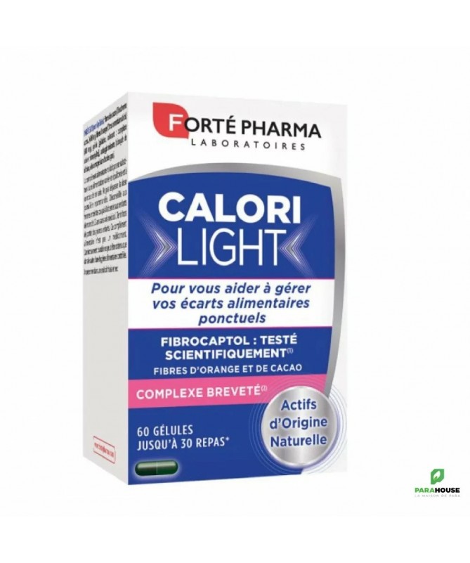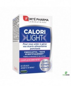 Forte Pharma CaloriLight 60 GELULES CaloriLight est un complément alimentaire naturel, basé sur une formule de FIBROCAPTOL une association exclusive de fibres d'orange et de cacao au fort pouvoir lipo-absorbant. Ses actifs d'origine naturelle peuvent aider à : pouvoir de capture des graisses ralentissement de la digestion diminution de la glycémie ralentissement de l’assimilation des sucres effet satiétant Conseil d'utilisation : Prendre 2 gélules au cours du repas que vous souhaitez alléger. En fonction de la corpulence de la personne et de la richesse du repas programmé Il est recommandé de prendre jusqu'à 4 gélules en une seule prise au cours du repas. NB: il faut pas depasser les 6 gélules maximum par jour. Composition : Fibres d'orange (Citrus aurantium dulcis), fibres de cacao (Theobroma cacao),colorants (E171, E102, E132)],gélule [gélatine], antiagglomérants (dioxyde de silicium, sels de magnésium d'acides gras