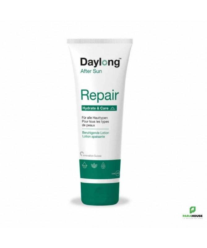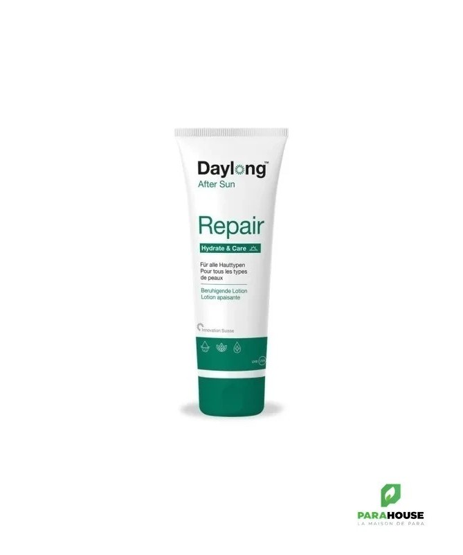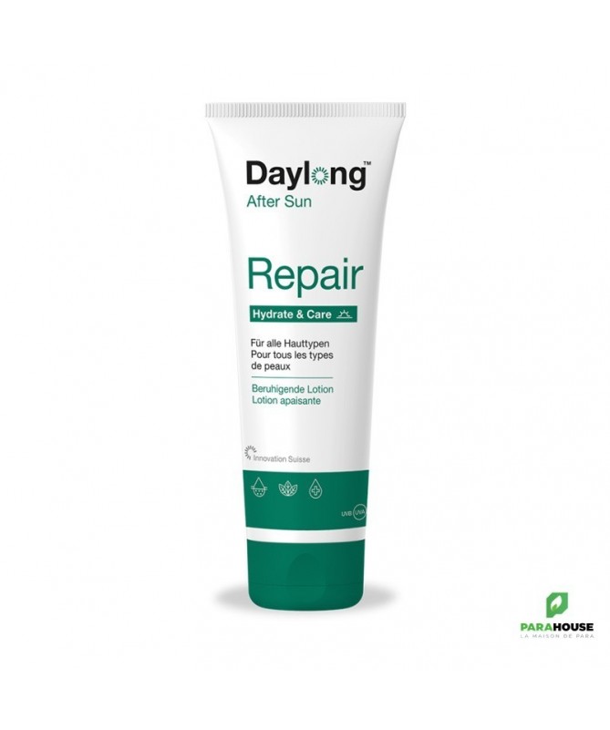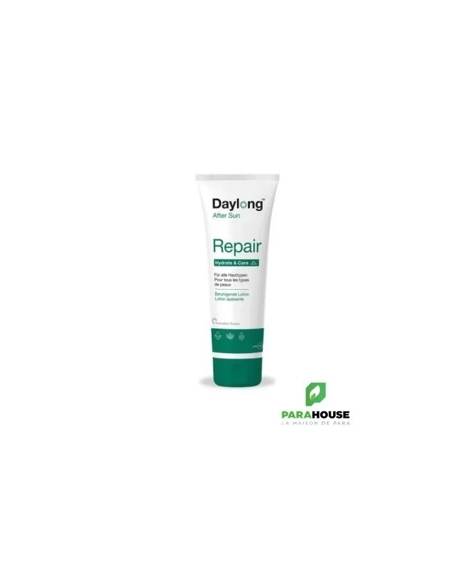 DAYLONG AFTER SUN REPAIR 100ML Daylong After Sun Repair est un lait liposomal réparateur après-soleil qui répare la peau. Il favorise les mécanismes de réparation naturels de la peau grâce à une enzyme encapsulée dans des liposomes, l'endonucléase, contribuant ainsi à réduire le vieillissement cutané prématuré. Sa formulation liposomale (molécules dont la structure est semblable à celle de la peau) apporte à votre peau de l’endonucléase, une enzyme de réparation de l’ADN, et favorise ainsi de manière active la régénération naturelle de la peau. Indications : Après une exposition au soleil on a besoin de DAYLONG AFTER SUN REPAIR . Après un traitement dermatologique on a besoin de ce lait. Visage et Corps Propriétés : Un lait sans paraben avec un bon parfum. DAYLONG AFTER SUN REPAIR hydrate et orévient du vieillissement prématuré. C'est un réparateur grâce à l'Endonucléase : enzyme de réparation de l'ADN, encapsulée dans des liposomes Plaisir et confort d’utilisation grâce à la formulation liposomale Une texture agréable avec une pénétration rapide. Non irritant Testé sous contrôle dermatologique Légèrement parfumé Conseils d’utilisation : Appliquer Daylong after sun Repair généreusement après exposition au soleil. L'application sur le visage et le corps. Composition : Aqua, Caprylic/Capric Triglyceride, Pentylene Glycol, Squalane, Behenyl Alcohol, Butyrospermum Parkii Butter, Glycerin, Panthenol, Tocopherol, Polyglyceryl-10 Pentastearate, Parfum, Sodium Stearoyl Lactylate, Carbomer, Xanthan Gum, Sodium Hydroxide, Disodium EDTA, Lecithin, Micrococcus Lysate, Phenoxyethanol