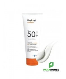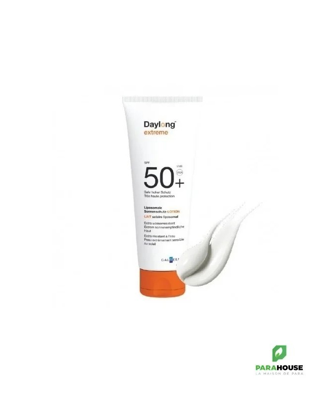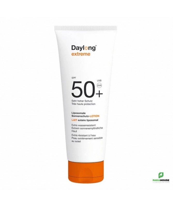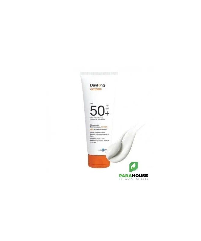 DAYLONG EXTREME Lait Solaire Liposomal SPF50+ 200ML DAYLONG EXTREME est un lait de protection solaire qui offre une très haute protection longue durée aux peaux les plus sensibles au soleil. DAYLONG ECRAN est Pour qui ? Peaux très claires (phototypes I et II) Peaux sujettes aux coups de soleil Ensoleillement extrême (montagne, tropique) Intolérance ou allergies solaires Propriétés de DAYLONG EXTREME Ni gras ni collant. Haute protection SPF+ Résiste à l'eau. Il est sans paraben et sans parfum. une haute protection sans traces blanches . Conseils d'utilisation Apliquer DAYLONG ECRAN avant 20 minutes de l'exposition. bien laisser pénétrer le produit. Eviter tout contact avec les yeux. L'application de trop faibles quantités de produit réduit considérablement l'efficacité de la protection. Renouveler l'application afin de maintenir la protection solaire, en particulier après avoir transpiré, nagé ou vous être essuyé. Rechercher l’ombre et évitez l’exposition en milieu de journée. Composition : Eau, méthylène bis-benzotriazolyl tétramethylbutylphénol (nano), salicylate d'éthylhexyle, lécithine, polymère réticulé acide acrylique/VP, diéthylhexyl butamido triazone, bis-éthylhexyloxyphénol méthoxyphényl triazine, pentylène glycol, butyl méthoxydibenzoylméthane, C12-15 alkyl benzoate, dibutyl adipate, diméthicone, phosphate de cétyle, alcool, sorbitol, tocophérol, décyle glucoside, propylène glycol, gomme xanthane, alcool cétylique, triéthanolamine, poudre de jus de feuille d'Aloe Barbadensis