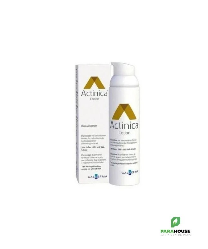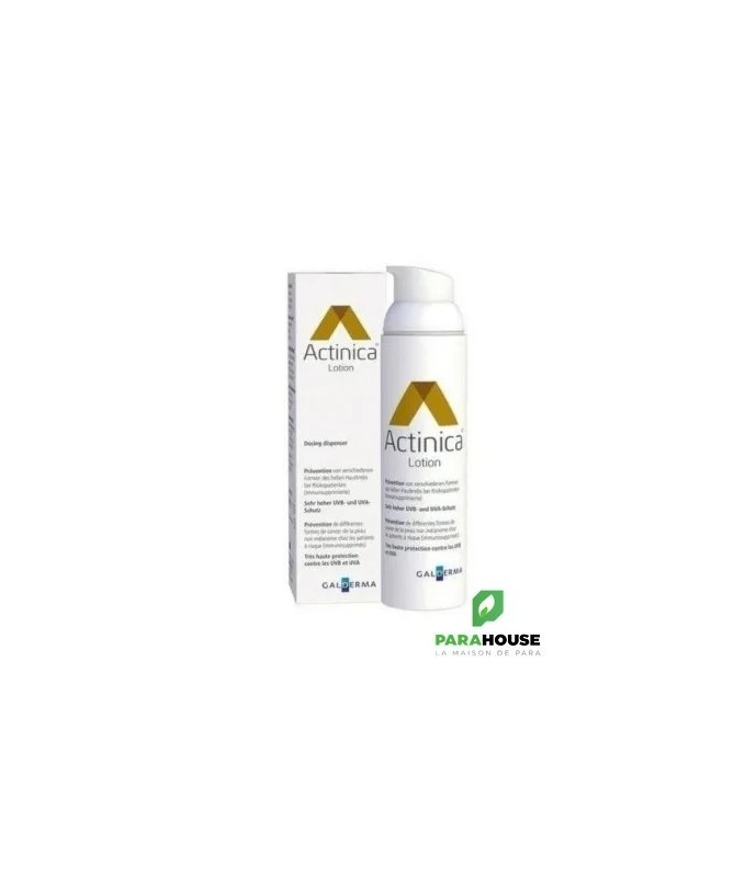 ACTINICA LOTION 80ML ACTINICA est un dispositif médical pour la prévention de différentes formes du cancer de la peau non mélanocytaire chez les patients à risque (immunosupprimés) La photoprotection constitue une mesure protectrice et préventive essentielle face au risque de cancer de la peau. Elle n'encourage en aucun cas à augmenter ou prolonger l'exposition solaire. Efficacité scientifiquement prouvée dans la prévention des KA et du carcinome épidermoïde (CE) chez les patients à haut risque : Actinica Lotion a significativement réduit le nombre de nouvelles plaques de KA chez les personnes à haut risque par rapport au groupe témoin utilisant différents produits Offre une protection à large spectre hautement efficace aussi bien contre les UVA que contre les UVB2 Convient à tous les types de peau car sans parfum et bien tolérée. Convient également aux peaux très sensibles Résistante à l’eau Crème solaire indice 50 Résultats : Les personnes qui utilisaient Actinica ont présenté une réduction de 53 % des plaques de KA 2 Composition : Bis-Ethylhexyloxyphenol, Methoxyphenyl Triazine, Ethylhexyl Triazone, Isoamyl p-Methoxycinnamate, Ethylexyl Methoxycinnamate, Methylene bis-Benzotriazolyl Tetramethylbuylphenol, Butyl Methoxydibenzoylmethane, Propyl-paraben, Methylparaben, Excipients. Sans parfum Sans émulsifiant PEG traditionnels. Conseils d'utilisation : Appliquez la Lotion avant d’appliquer d’autres produits cosmétiques (laissez Actinica Lotion pénétrer dans la peau quelques minutes avant d’appliquer d’autres produits) Utilisez la tout au long de l’année et appliquez-la généreusement chaque matin sur les zones exposées au soleil. Renouvelez l’application particulièrement en cas d’exposition prolongée, après un contact prolongé avec l’eau ou une forte transpiration ou après vous être essuyé