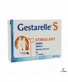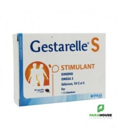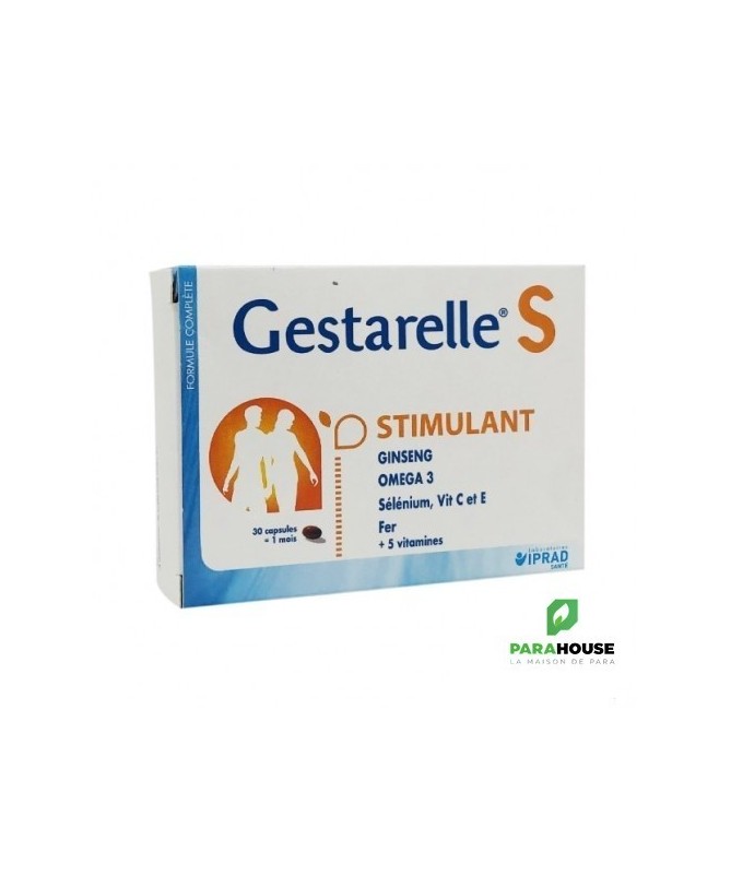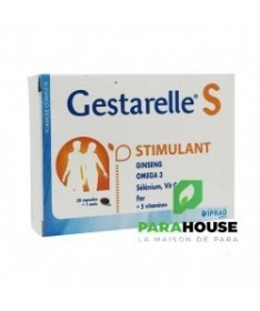 DescriptionFemme active.Ginseng, fer, vitamines C et E.Gestarelle S Femme Active est un complément nutritionnel à base de Ginseng, Fer et Vitamines spécialement formulé pour combattre les baisses de forme, vitalité.Le ginseng dont les racines, utilisées depuis longtemps en extrême Orient est connu pour ses propriétés stimulantes. La vitamine C stimule les défenses de l'organisme. Sélénium et vitamines C et E participent par leur action anti-oxydante à la lutte contre les effets du vieillissement. Les vitamines du groupe B participent au maintien en bon état de la peau et des cheveux, et du système nerveux et musculaire. Le fer en contribuant à éviter la carence martiale tend à prévenir la sensation de fatigue. La présence de DHA contribue à combattre les risques cardi-vasculaires.Conseils d'utilisation1 capsule de Gestarelle S Femme Active par jour.CompositionHuile de poisson (anti-oxydant : mélange de tocophérols; arôme : extrait de plantes); tunique : gélatine; acide ascorbique (vitamine C); humectant : glycérol;extrait sec de ginseng; sulfate de fer; acétate de dl-alpha-tocophérol (vitamine E); anti-agglomérant : mono et di-glycéride d'acide gras; panthoténate de calcium (vitamine B5); riboflavine (vitamine B2); mononitrate de thiamine (vitamine B1); colorants : E171, E172; acide folique (vitamine B9); sélénate de sodium; biotine (vitamine B8).sans gluten