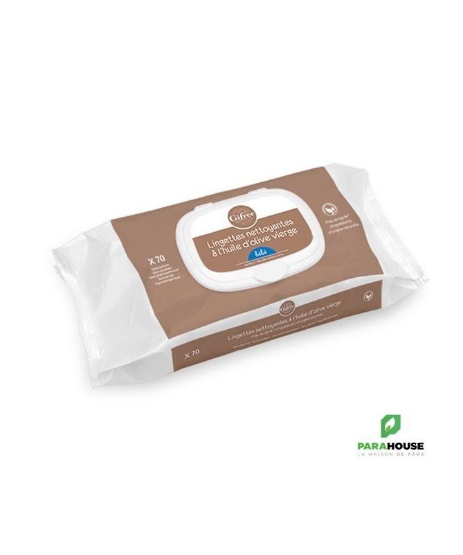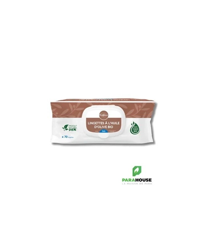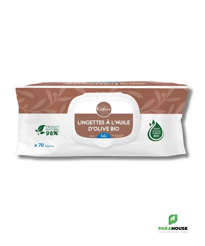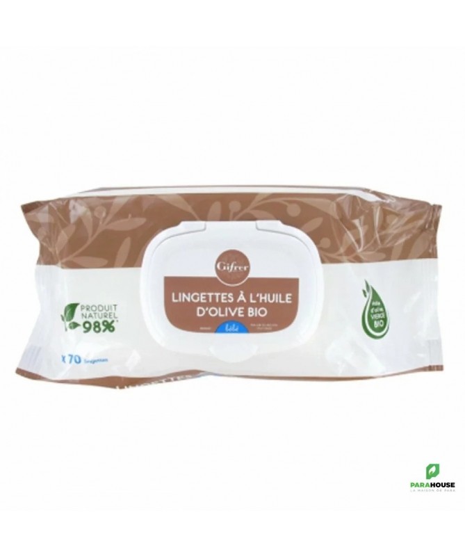 GIFRER Lingettes nettoyantes à l'huile d'olive - 70 PCS GIFRER Lingettes nettoyantes à l'huile d'olive sont idéales pour nettoyer correctement et en douceur la peau de bébé. Les Lingettes nettoyantes Gifrer permettent de faire la toilette de bébé en toute simplicité et praticité. Elles nettoient bébé tout en hydratant et en protégeant la peau grâce à l'huile d'olive vierge qui les compose. Leur efficacité proche au liniment permet de garantir une peau douce et apaisée. Résultat : bébé est tout propre et en douceur. Dans un souci de préservation de la santé des tout-petits, nous avons sélectionné pour vous ces lingettes pour bébé, garanties sans phenoxyethanol, sans methylisothiazolinone et sans paraben. Composition: Aqua, Glycerin, Polysorbate 20, Sodium Benzoate, Olea Europaea Fruit Oil, Potassium Sorbate, Bisabolol, Carbomer, Caprylyl Glycol, Sodium Hydroxide, Tropolone, Acrylates/C10-30 Alkyl Acrylate Crosspolymer, Tocopheryl Acetate, 1,2-Hexanediol, Lingettes composées de près de 98.6% d'ingrédients d'origine naturelle. Conseils d'utilisation Il est recommandé d'appliquer les lingettes Gifrer sur la peau des bébés sans rincer.Refermer après usage. Il est préferable d'eviter l'usage des lingettes en cas d'irritation de la peau ou sur des lésions suintantes.