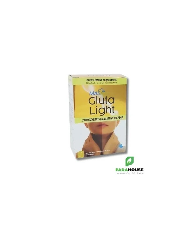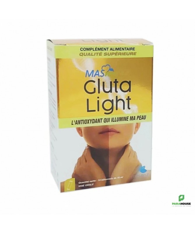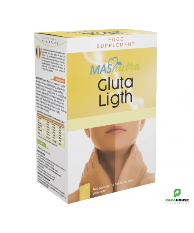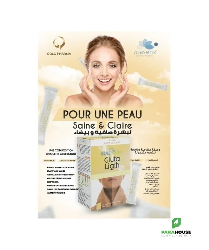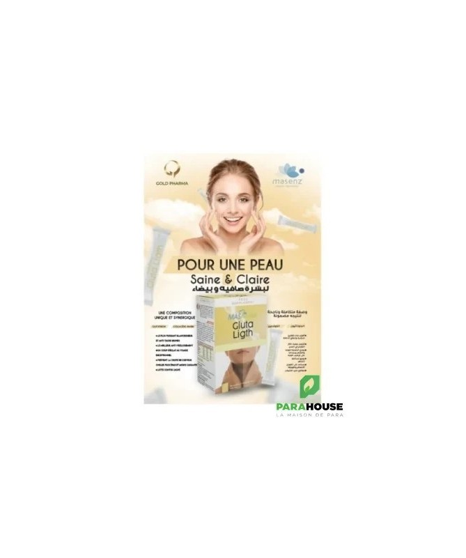 MASNUTRA GLUTA LIGHT 14 STICKS Nouvelle Formules avec 200 Glutathione GLUTA LIGHT 14 STICKS est une combinaison de collagène, d'extraits naturels, de vitamines et de minéraux aux effets bénéfiques pour une peau saine et légère. Le GLUTATHION est un puissant blanchisseur Et anti-tache brunes, Roi des antioxydants, Améliore la durée de vie et l’efficacité des vitamines C et E, stimule la production de collagène et joue un rôle majeur dans l’élimination des toxines. GLUTA LIGHT : Convient à tous les types de peau Action Eclaircissante : Glutathion, Vitamine C. Vitamine E. Vitamine 83 Action Anti-Age : Giutathion, Colagène. Vitamine C, Vitamine E Action Cicatrisante : Colagëne, Zinc, Cuivre, Vitamine C Action Hydratante : Giutathion, Colagène. Vitamine 83 Action Anti-inflammatoire : Glutathion,L'extrait de feuilles de thé, Zinc, Vitamine B3 Action Sébo-régulatrice : L'Estrait de feuilles de thé, Zinc, Vitamine B3 Action Purifiante : Glutathion, "Extrait de feuiles de thé Assure la santé et repousse des cheveux et angles : Collagéne, Vitamine BB, Vitarine B2 Composition : Vitamine C : Parfaite pour booster l'éclat du teint. Idéale pour préserver la jeunesse de la peau Un excellent bouclier pour protéger la peau des UV Prévient l'apparition des taches brunes Vitamine E : Peau douce et souple Lutte contre le vieillissement cutané Soulage et répare les peaux abimées : action cicatrisante The : Purifie lapeau Assainit le cuir chevelu Préserve la jeunesse cutanée Protege la peau des UV Un grand pouvoir dépoluant Zinc : Favoris la cicatrisation de la peau et des plaies Intervient dans la synthése des protéines dont collagène et l'élastine Réguie la production de sébum Cuivre : Essentiel à la production de collagene Posséde de puissantes propriétés biocides [protection] Vitamine B3 : Action anti-inflammatoire Action anti taches brunes Action antiprurigineuse Limite la production de sébuim