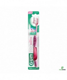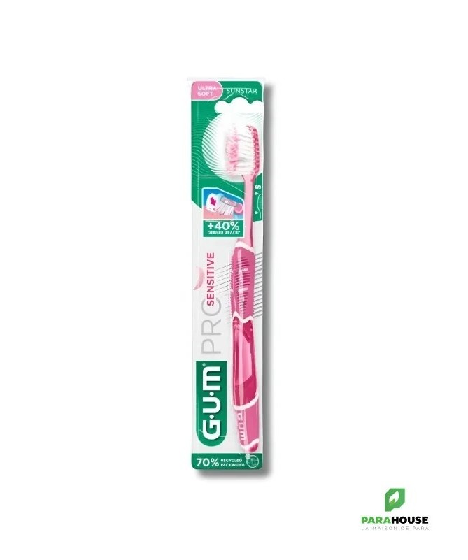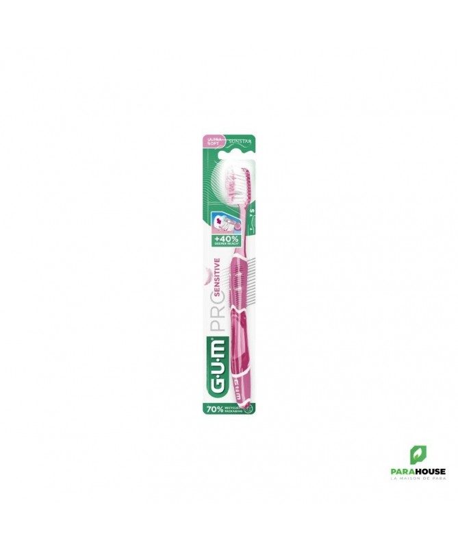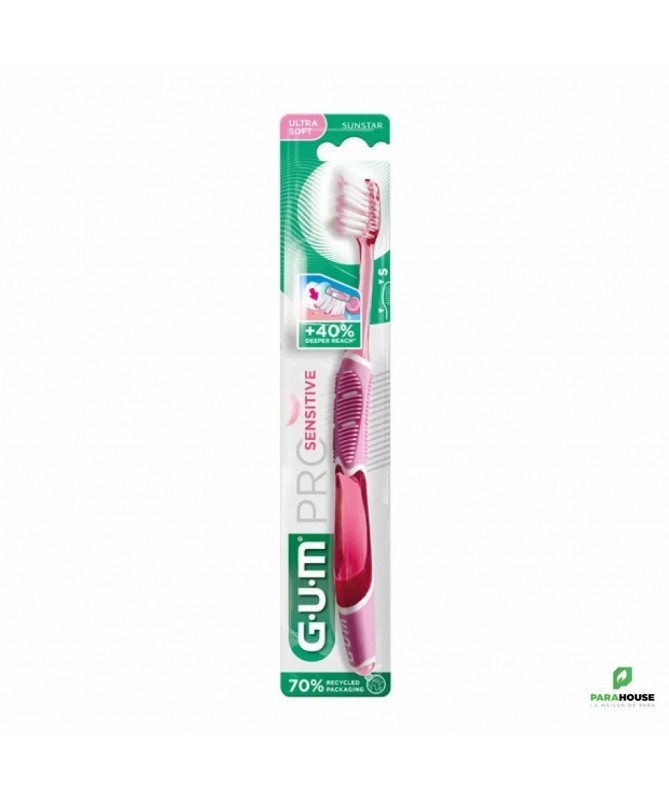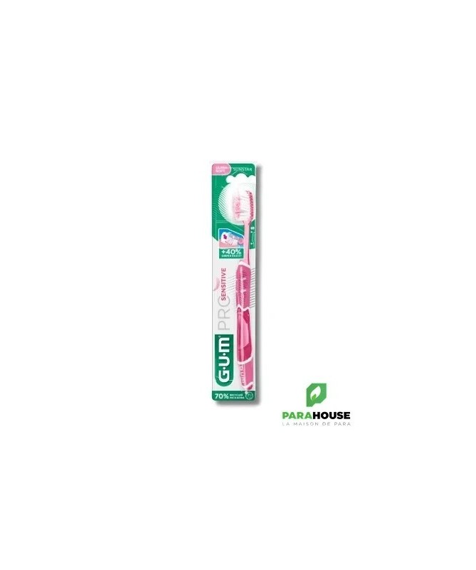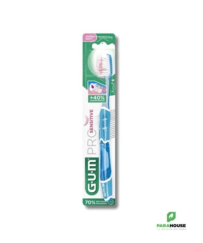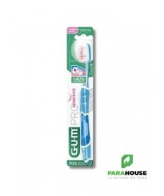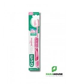 GUM Brosse à Dents Pro Sensitive 510Labrosse à dents GUM Pro Sensitive 510est conçue pour un brossage quotidien ultra-doux et en profondeur, idéale pour les dents sensibles et les gencives délicates.Caractéristiques :- Brins effilés (1/100ème) pénétrant 40% plus profondément dans le sillon gingival.- Brins ultra-souples (15/100ème) assurant un brossage efficace tout en douceur.- Manche ergonomique optimisant l’angle de brossage à 45°.- Fourni avec un capuchon protecteur pour une meilleure hygiène.Conseils d'utilisation :Il est conseillé de se brosser les dents après chaque repas.Indication :Convient aux personnes souffrant de sensibilité dentaire ou recherchant un soin doux pour les gencives.