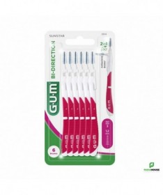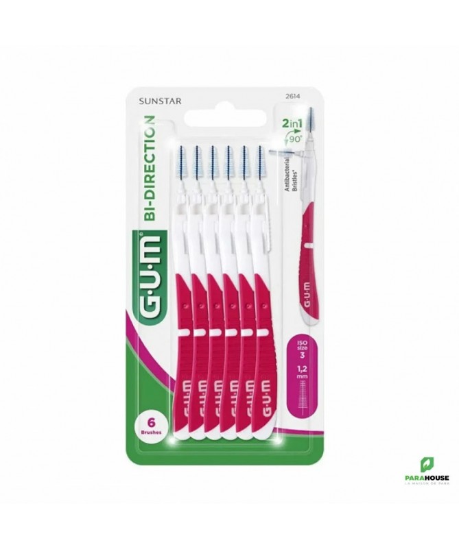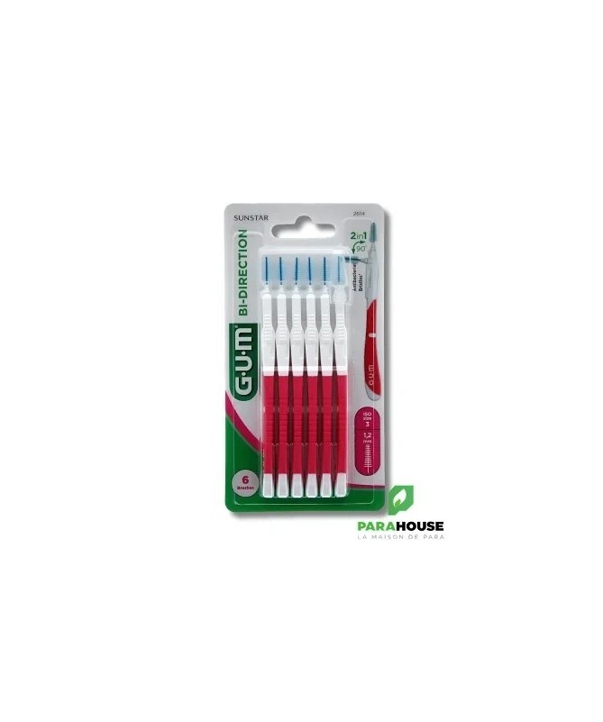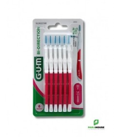 Brossettes Interdentaires GUM Bi-Direction 1.2mmLes brossettes interdentaires GUM Bi-Direction 1.2mm sont conçues pour éliminer efficacement la plaque dentaire entre les dents, même dans les zones difficiles d'accès.Caractéristiques :- Tête orientable à 180° pour les dents de devant et à 90° pour atteindre facilement les dents du fond- Brins en forme triangulaire permettant d’éliminer jusqu’à 25% de plaque en plus- Tige enrobée de nylon, arrondie pour un confort optimal et une meilleure protection des gencives- Brins imprégnés de chlorhexidine, un agent antibactérien- Capuchon de protection pour une hygiène parfaite entre chaque utilisation- Manche bi-matière ergonomique pour une prise en main confortable- Recommandées par les dentistes- Disponibles en 3 taillesConseils d'utilisation :- Utiliser au moins une fois par jour, de préférence après le repas du soir- Humidifier la brossette avant usage- Insérer délicatement la brossette en l’inclinant légèrement vers l’avant- Faire un léger mouvement circulaire pour faciliter l’insertion- Effectuer des mouvements de va-et-vient- Rincer soigneusement après chaque