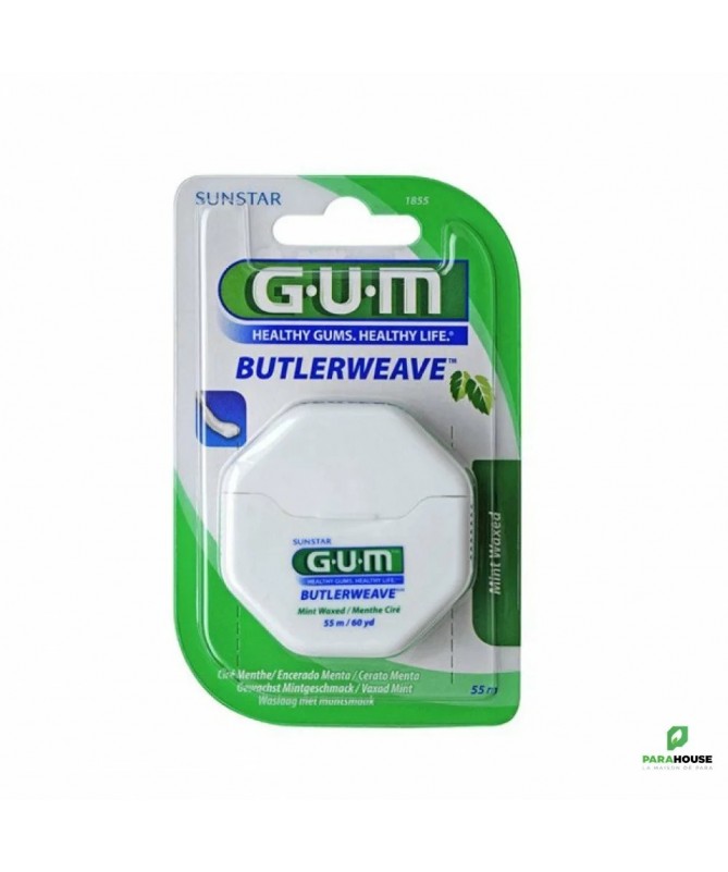 GUM FIL DENTAIRE CIRE MENTHOL 54,8M 1855 Fil dentaire en ciré mentholé (ref. 1855). Constitué de filaments tressés pour permettre une meilleure élimination de la plaque dentaire. Dimensions : longueur 54,8 m. Composition : Hygiène dentaire, plaque dentaire. Fil dentaire ciré à la menthe. Constitué de filaments tressés pour permettre une meilleure élimination de la plaque dentaire.*Résiste à l'effilochage et ne casse pas. Dimensions : longueur 54,8 m. Conditionnement : boîte plastique avec coupe-fil, sous blister.