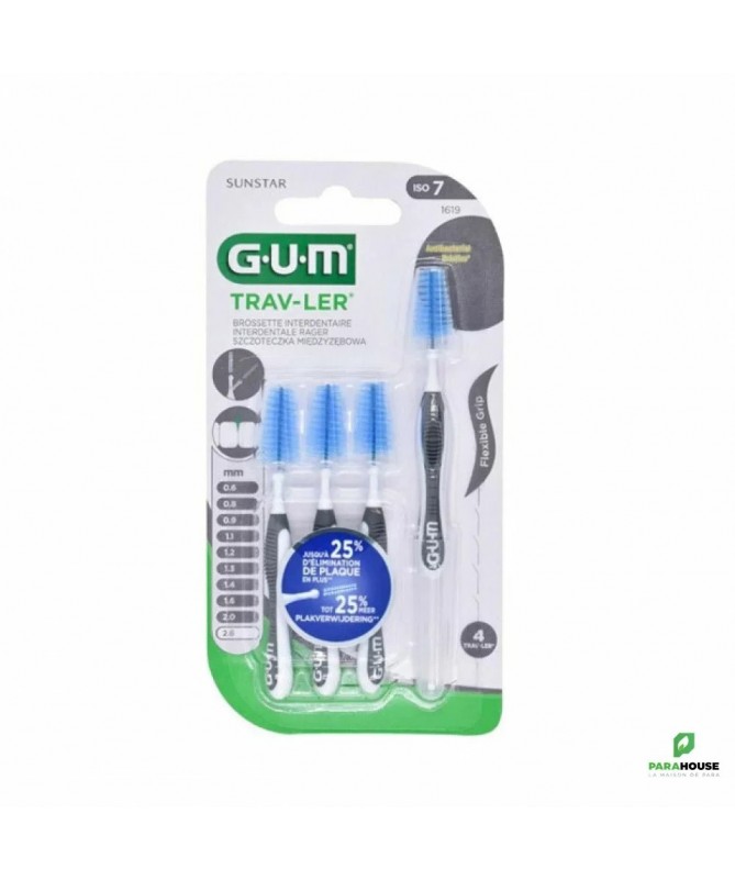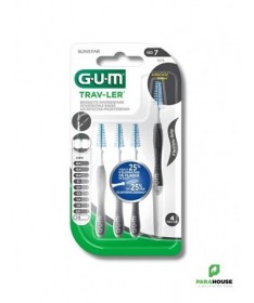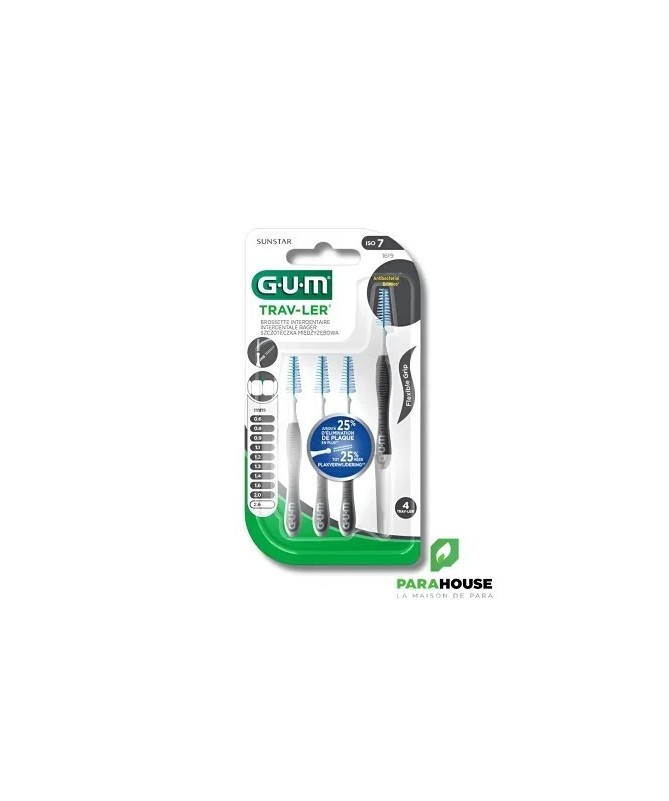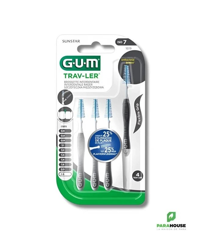 GUM TRAV-LER BROSSETTES x4 2.6MM 1619 GUM TRAV-LER BROSSETTES x4 2.6MM 1619 : Lot de 4 brossettes interdentaire extrafine de voyage. Hygiène dentaire, nettoyage des espaces interdentaires. Constituée d'une hampe métallique. Brins imprégnés d'un antiseptique. Se présente avec un fermoir de voyage, pouvant être employé pour allonger le manche. Présentation : Diamètre brossette 2,6 mm, code couleur gris. La nouvelle brossette GUM Trav-Ler a été développée pour apporter un maximum de confort et d’efficacité Jusqu’à 25% de plaque supplémentaire éliminée grâce à ses brins de forme triangulaire (comparé à un filament en nylon classique) Confort d’utilisation et contrôle améliorés grâce à son manche flexible, muni d’un grip anti dérapant et d’un cou coudable, facilitant l’accès aux dents postérieures. Afin de diminuer les risques traumatiques et d’endommagement de l’émail de la dent, la tige métallique est recouverte de nylon. L’extrémité ronde du manche permet de stopper la brossette pour protéger la gencive. Les brins sont imprégnés de Chlorhexidine, agent anti-bactérien de référence, permettant de maintenir la brossette propre entre chaque utilisation. Le capuchon permet d’éviter la contamination des brins. Composition : Fibres synthétiques en nylon imprégnées de chlorhexidine. Conseils d'utilisation : Utiliser avec des gestes modérés. Ne pas forcer dans les espacs intermédiaires serrés. Rincer la brossette après chaque utilisation. Changer la brossette après une semaine d'utilisation.