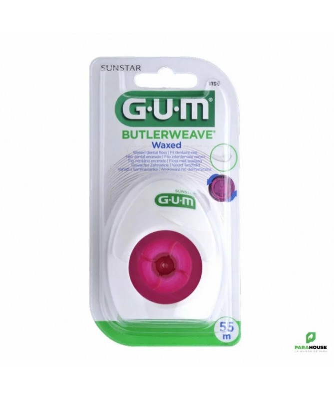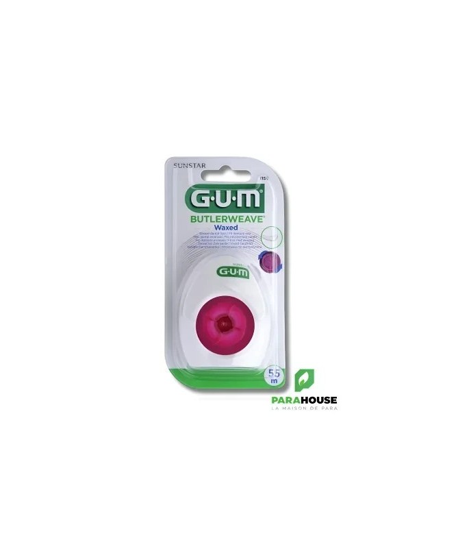 Fil Dentaire GUM ButlerWeave Waxed (1155)Le fil dentaire GUM ButlerWeave Waxed est conçu pour une hygiène bucco-dentaire optimale. Sa structure tissée et cirée permet d’éliminer efficacement la plaque et les résidus alimentaires, même dans les espaces interdentaires étroits, tout en respectant les gencives.Caractéristiques :Fil dentaire ciré pour un glissement facileMicrofibres tressées pour un nettoyage efficaceDoux pour les gencives, réduit les irritationsÉlimine plaque dentaire et résidus alimentairesManche ergonomique pour une utilisation confortableFormat pratique pour domicile ou déplacementConseils d’utilisation :Lavez vos mains avant chaque utilisation.Déroulez environ 45 cm de fil et enroulez-le autour de vos doigts.Insérez délicatement le fil entre vos dents avec des mouvements de va-et-vient.Formez un "C" autour de chaque dent pour enlever la plaque efficacement.Nettoyez également la partie inférieure des gencives avec des mouvements doux.Utilisez au moins une fois par jour, de préférence après le brossage.Jetez le fil utilisé à la poubelle.L’usage quotidien du fil dentaire GUM ButlerWeave aide à prévenir caries, gingivite et mauvaise haleine, pour une bouche saine et propre.
