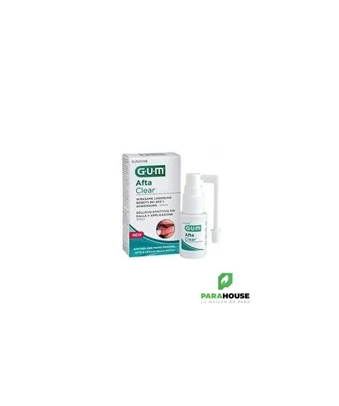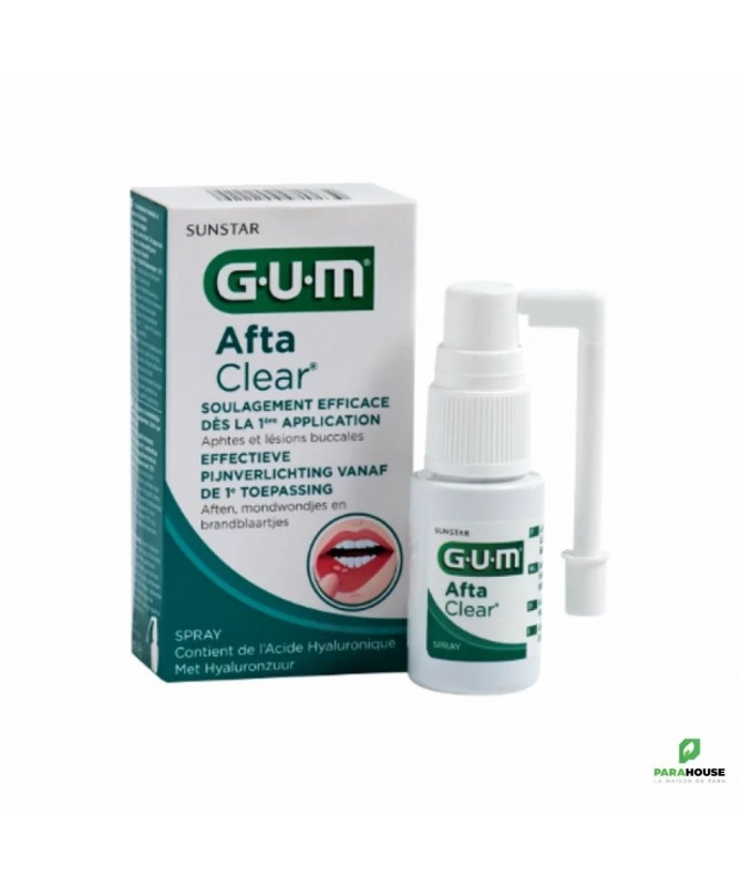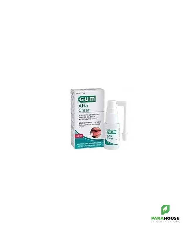 GUM Spray AftaClear - Aphtes et Lesions Buccales 15ML GUM Spray AftaClear permet de soulager rapidement la douleur dès la première application. La formule unique forme rapidement une barrière protectrice pour les ulcères et autres lésions de la bouche, ce qui la rend idéale pour prévenir la récurrence et/ou la progression des sites où les médicaments ne peuvent pas être appliqués facilement ou de manière fiable. Contient de l'acide hyaluronique pour améliorer la réparation des tissus, sans alcool ni conservateurs qui peuvent piquer, brûler ou provoquer un engourdissement ou une sécheresse. Conseils d'utilisation : Il est conseillé de pulvériser GUM AftaClear Spray sur la lésion jusqu'à 3 fois par jour, après les repas, pendant une semaine. Il est recommandé d’éviter de manger ou de boire pendant au moins 30 minutes après l’application. Composition : Eau, propanediol, hydrolysat d'amidon hydrogéné, propylène glycol, citrate de sodium, polycarbophile, huile de ricin hydrogénée et éthoxylée, taurine, xylitol, maltodextrine, gluconolactone, extrait de tige figuier de Barbarie, extrait de feuille d'olivier, acide citrique, benzoate de sodium, hydroxyde de sodium, hyaluronate de sodium, bisabolol, sucralose, arôme, extrait de Stevia rebaudania, gluconate de calcium, extrait de racine de gingembre.