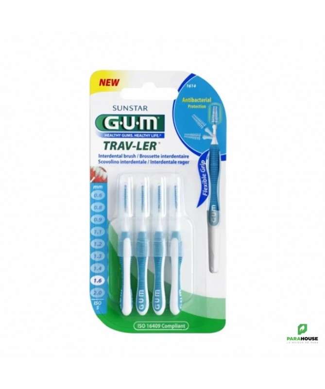 GUM TRAV-LER BROSSETTES X4 1.6MM 1614 GUM TRAV-LER BROSSETTES X4 1.6MM 1614 : Lot de 4 brossettes interdentaire. Hygiène dentaire, nettoyage des espaces interdentaires. Gum trav-ler est une brossette Interdentaire ambulatoire, elle est prête à l’emploi. Petite et pratique, son capuchon sert de manche pour mieux accéder aux zones postérieures. Les brossettes Gum trav-ler sont protégées par un agent antibactérien, la chlorhexidine, qui inhibe la croissance bactérienne sur les brossettes jusqu’à 2 semaines. Le capuchon protège la brossette tout en lui permettant de sécher. Tête cylindrique adaptée à un espace interdentaire à partir de 1.6 mm. Code couleur: bleu. Choisir la taille de la brossette en fonction de l’espace interdentaire (plus ou moins large). Sa forme pourra dépendre de la localisation des espaces (de préférence, cylindrique au niveau des incisives, conique au niveau des molaires). La nouvelle brossette GUM Trav-Ler a été développée pour apporter un maximum de confort et d’efficacité Jusqu’à 25% de plaque supplémentaire éliminée grâce à ses brins de forme triangulaire (comparé à un filament en nylon classique) Confort d’utilisation et contrôle améliorés grâce à son manche flexible, muni d’un grip anti dérapant et d’un cou coudable, facilitant l’accès aux dents postérieures. Afin de diminuer les risques traumatiques et d’endommagement de l’émail de la dent, la tige métallique est recouverte de nylon. L’extrémité ronde du manche permet de stopper la brossette pour protéger la gencive. Les brins sont imprégnés de Chlorhexidine, agent anti-bactérien de référence, permettant de maintenir la brossette propre entre chaque utilisation. Le capuchon permet d’éviter la contamination des brins Composition : Fibres synthétiques en nylon imprégnées de chlorhexidine. Conseils d'utilisation : Utiliser avec des gestes modérés. Ne pas forcer dans les espacs intermédiaires serrés. Rincer la brossette après chaque utilisation. Changer la brossette après une semaine d'utilisation.
