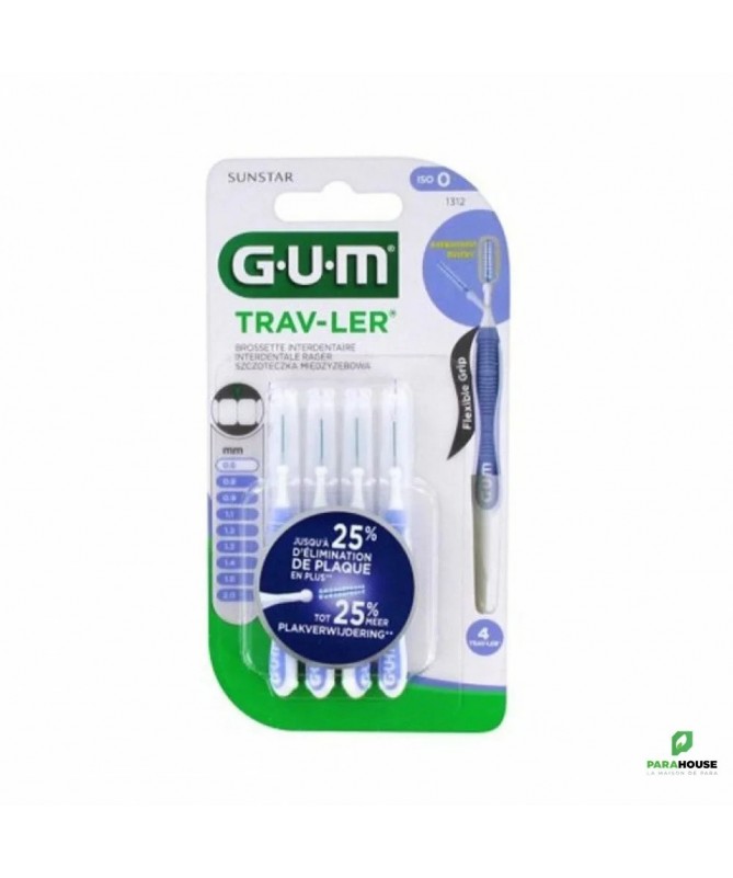 GUM TRAV-LER BROSSETTE x4 0.6MM 1312 Protection antibactérienne Manche flexible Elimination professionnelle de la plaque pour une santé des gencives otpimum jusqu'à 25% de plaque supplémentaire éliminée, grâce à ses brins de forme triangulaire confort d'utilisation et contrôle améliorés grâce à son manche flexible, muni d'un grip anti-dérapant et d'un cou coudable, facilitant l'accès aux dents postérieures les brins brevetés sont imprégnés de chlorhexidine, agent antibactérien de référence, permettant de maintenir la brossette propre entre chaque utilisation Utiliser avec des gestes modérés Ne pas forcer dans les espaces interdentaires serrés Rincer la brossette après chaque utilisation Changer de brossette après une semaine d'utilisation Conseils d'utilisation : Il est recommandé de se brosser les dents après chaque repas