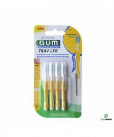 GUM TRAV-LER BROSSETTES X4 1.3MM 1514 GUM TRAV-LER BROSSETTES X4 1.3MM 1514 : Lot de 4 brossettes interdentaire extrafine de voyage. Hygiène dentaire, nettoyage des espaces interdentaires. Constituée d'une hampe métallique. Brins imprégnés d'un antiseptique. Se présente avec un fermoir de voyage, pouvant être employé pour allonger le manche. Présentation : Diamètre brossette 1,3 mm, code couleur jaune. La nouvelle brossette GUM Trav-Ler a été développée pour apporter un maximum de confort et d’efficacité Jusqu’à 25% de plaque supplémentaire éliminée grâce à ses brins de forme triangulaire (comparé à un filament en nylon classique) Confort d’utilisation et contrôle améliorés grâce à son manche flexible, muni d’un grip anti dérapant et d’un cou coudable, facilitant l’accès aux dents postérieures. Afin de diminuer les risques traumatiques et d’endommagement de l’émail de la dent, la tige métallique est recouverte de nylon. L’extrémité ronde du manche permet de stopper la brossette pour protéger la gencive. Les brins sont imprégnés de Chlorhexidine, agent anti-bactérien de référence, permettant de maintenir la brossette propre entre chaque utilisation. Le capuchon permet d’éviter la contamination des brins. Composition : Fibres synthétiques en nylon imprégnées de chlorhexidine. Conseils d'utilisation : Utiliser avec des gestes modérés. Ne pas forcer dans les espacs intermédiaires serrés. Rincer la brossette après chaque utilisation. Changer la brossette après une semaine d'utilisation.