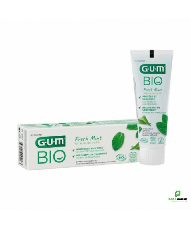 GUM BIO Gel Dentifrice 75ML GUM BIO Gel Dentifrice est une solution naturelle et biologique pour protéger vos dents et vos gencives. Avec 99% d’ingrédients d'origine naturelle et 22% d’ingrédients issus de l'agriculture biologique, le dentifrice GUM BIO est doux pour les gencives et les dents. Nous avons inclus du fluor dans sa formulation, conformément aux recommandations des experts en santé bucco-dentaire et de la Fédération Européenne de Parodontologie (EFP), afin de renforcer l’émail et de favoriser la prévention des caries. Le soin apporté aux dents et aux gencives répond aux mêmes critères que pour l'ensemble de notre gamme de dentifrices GUM. GUM BIO Dentifrice contient de l'aloe vera et de la menthe poivrée d'origine biologique, pour une fraîcheur au quotidien. Composition : Sorbitol, hydrated silica, Mentha piperita leaf water (20%)*, aqua, Aloe barbadensis leaf juice (2%)*, lauryl glucoside, xanthan gum, aroma, sodium fluoride, sodium benzoate, Stevia rebaudiana extract, citric acid, potassium sorbate, limonene. Formule douce contenant 99% d’ingrédients d'origine naturelle, et 22% d'ingrédients issus de l'agriculture biologique : aloe vera et menthe poivrée Certifié biologique et vegan Contient du fluor pour renforcer l'émail et favoriser la prévention des caries Aide à apaiser les gencives suite au brossage avec l'aloe vera Arôme naturel de menthe poivrée pour une haleine fraîche Sans colorant, sans gluten et sans lactos Conseils d'utilisation : Pour les adultes et les enfants âgés de 7 ans et plus. Se brosser les dents 2 à 3 fois par jour.