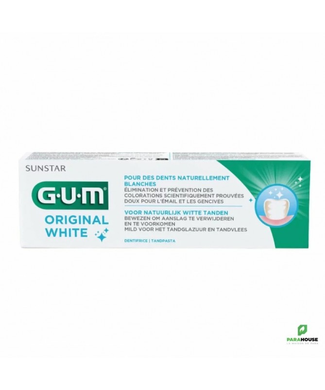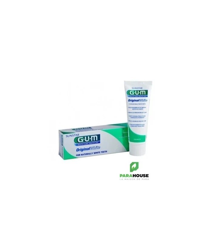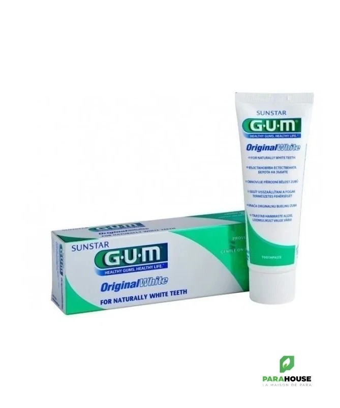 GUM ORIGINAL WHITE DENTIFRICE ANTI-TACHE 75ML Dentifrice anti-tache à efficacité cliniquement démontrée. Doux pour les gencives. Renforce et protège l'email dentaire. Fraîcheur longue durée. La blancheur naturelle des dents peut être altérée par la nourriture, certaines boissons - telles le café, le thé, ou le vin - le tabac, certains médicaments, ou simplement par l'âge. Gum original White vous offre la possibilité d'éliminer ces colorations en douceur et de prévenir leur réapparition grâce à une formule originale sans agent agressifs et dont l'efficacité a été cliniquement démontrée. De plus, GUM Original White contient du fluor pour mieux protéger et renforcer l'émail dentaire au quotidient. Trois actions complémentaires : Elimine les tâches à la surface des dents grâce aux micro-particules de silice à haut pouvoir nettoyant, laissant une sensation de dents lisses et brillantes, sans abîmer l'émail dentaire. L'actif anti-colorations Stan Clea dissout les particules resposnables des colorations au niveau des irrégularités de l'émail, ne contient pas d'agent blanchissant agreszsif. Renforce et protège l'émail dentaire grâce au fluor Action original white Composition : Formule INCI : sorbitol, glycerin, PEG-8, Aqua, hydrated silica, titanium, dioxide, aroma, disodium C12-14, cellulose gum, sodium sacchari, potassium acesulfame, sodium laureyl sulfate, PEG-60 hydrogenated castor oil, pareth-2 sulfosuccinate, sodium fluoride, o-Cymnen-5-ol, limonene, linalool. Conseils d'utilisation : Utiliser le dentifrice sur une brosse à dent GUM souple ou medium. Brosser après chaque repas ou au moins deux fois par jour pendant 3 minutes.