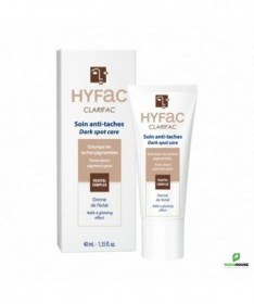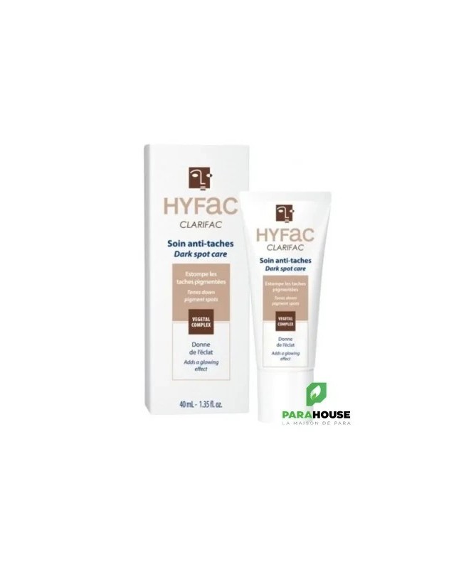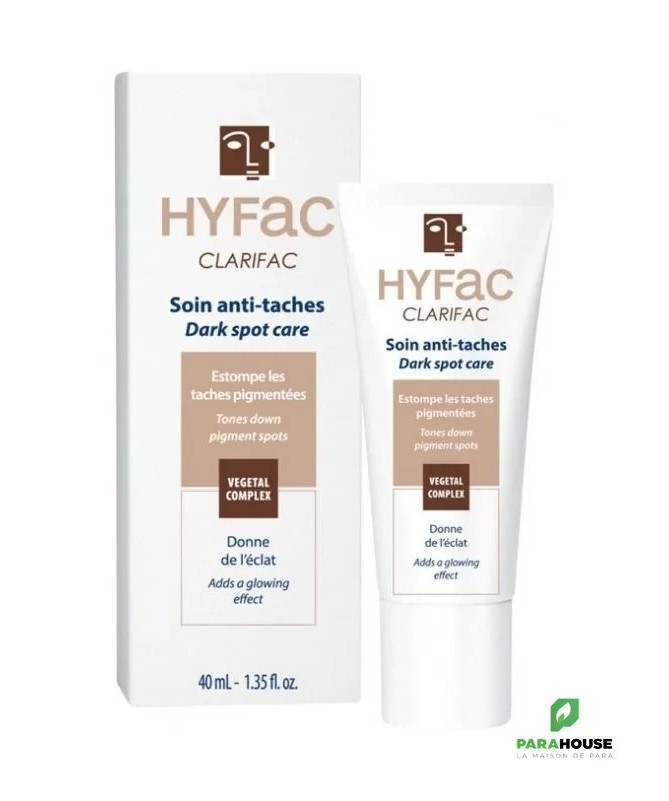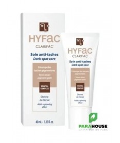 Hyfac Clarifac Soin Anti Taches 40ML Hyfac Clarifac Soin Anti Taches est un soin pour le visage destiné aux peaux qui présentent des taches pigmentées dues à l'exposition au soleil, à l'âge, à un traitement médicamenteux ou à des cicatrices résiduelles d'acné. Ce soin sous forme de crème permet d'estomper les taches, d'éclaircir le teint tout en apportant la juste dose d'hydratation à la peau et en la protégeant des rayons UV grâce à son SPF 30. L'action anti taches du soin Clarifac repose sur l'association de deux actifs qui vont cibler les trois étapes de la mélanogénèse, qui correspond au processus de synthèse de la mélanine, élément responsable de la coloration de la peau. On retrouve ainsi dans la composition de ce soin de l'extrait d'algue Dictyoptéris membranacea, un composant qui inhibe et retarde la synthèse de la mélanine puis l'empêche de remonter jusqu'à la surface de la peau, ce qui entraînerait l'apparition de taches. Ce soin anti taches Hyfac Clarifac contient également de l'extrait de lys blanc, reconnu pour ses vertus éclaircissantes au niveau du grain de peau et son action sur la réduction des taches pigmentaires. Doté d'une texture légère qui pénètre rapidement dans la peau, le soin anti-taches Clarifac redonne de l'éclat au teint et protège la peau au quotidien contre l'apparition de nouvelles taches. Composition : COMPOSITIONS / INGREDIENTS INCI : AQUA (WATER) / EAU, OCTOCRYLENE, DICAPRYLYL CARBONATE, GLYCERIN, METHYLENE BIS-BENZOTRIAZOLYL TETRAMETHYLBUTYLPHENOL [NANO], CYCLOPENTASILOXANE, PENTYLENE GLYCOL, BIS-ETHYLHEXYLOXYPHENOL METHOXYPHENYL TRIAZINE, OLEYL ERUCATE, CETEARYL ALCOHOL, CI 77891 (TITANIUM DIOXIDE), COCO-GLUCOSIDE, MARIS AQUA (SEA WATER) / EAU DE MER, ISOPROPYL ISOSTEARATE, DECYL GLUCOSIDE, PARFUM (FRAGRANCE), DIPHENYL DIMETHICONE, HYDROXYETHYL ACRYLATE/SODIUM ACRYLOYLDIMETHYL TAURATE COPOLYMER, TOCOPHERYL ACETATE, BUTYROSPERMUM PARKII (SHEA) BUTTER, SQUALANE, XANTHAN GUM, DIMETHICONE, TETRASODIUM GLUTAMATE DIACETATE, SODIUM BENZOATE, STEARIC ACID, CITRIC ACID, SILICA, o-CYMEN-5-OL, POLYHYDROXYSTEARIC ACID, POLYSORBATE 60, ALUMINA, ASCORBYL TETRAISOPALMITATE, ALGAE EXTRACT, PROPYLENE GLYCOL, LILIUM CANDIDUM FLOWER EXTRACT, SORBITAN ISOSTEARATE, PRUNUS CERASUS (BITTER CHERRY) FLOWER EXTRACT, TOCOPHEROL, POTASSIUM SORBATE. Conseils d'utilisations: Appliquer le soin anti taches CLARIFAC creme sur le visage et le cou préalablement nettoyés et séchés. Utiliser 2 fois par jour, idéalement le matin et le midi en évitant le contour des yeux.