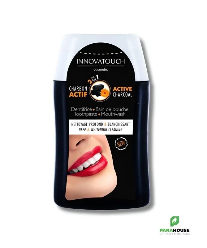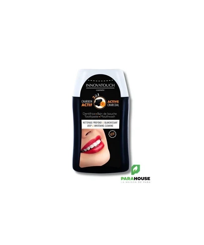2 en 1 au Charbon Actif Innovatouch CosmeticCe soin 2 en 1 au charbon actif offre un nettoyage en profondeur et un effet blanchissant. À utiliser chaque jour comme dentifrice et 3 à 4 fois par semaine (ou plus si besoin) comme bain de bouche : ajoutez de l'eau directement dans la bouche, gardez 30 secondes en vous gargarisant puis recrachez.Aide à réduire les taches et blanchir les dentsFacilite l'élimination de la plaque bactérienneAgit contre la mauvaise haleine