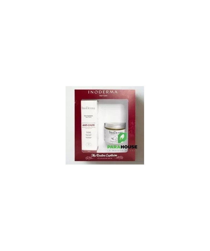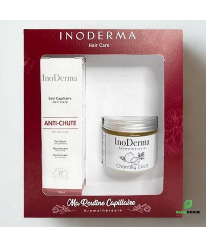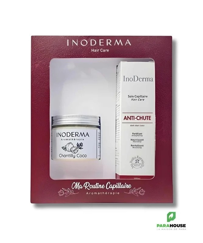 - INODERMA SOIN ANTI CHUTE 100MLInoDermaAnti-Chute est un soin capillaire traitant et sculptant qui redonne force et résistance aux cheveux. Il stimule la croissance, freine la chute et fortifie la racine. Grâce à sa formule 100% naturelle à base de 5 Huiles Essentielles et 5 Huiles Végétales, InoDerma Anti-Chute permet d’avoir des cheveux fortifiés, résistants, nourris, brillants et moins cassants.- INODERMA CHANTILLY COCO 150GInoDerma Chantilly Coco est un complexe composé d'huile végétale de noix de coco vierge, de beurre de karité, d'huile végétale de jojoba et de vitamine E.Nourrissant et régénérant pour la peau et les cheveux , il hydrate , adoucit et assouplit les peaux sèches à très sèches , nourrit et répare les cheveux abimés . Convient à tous les types de peaux Prélever une noisette de Inoderma Chantilly Coco , la mettre entre la paume des deux mains, frotter puis appliquer sur la peau ou en masque sur les cheveux avant le shampoing .