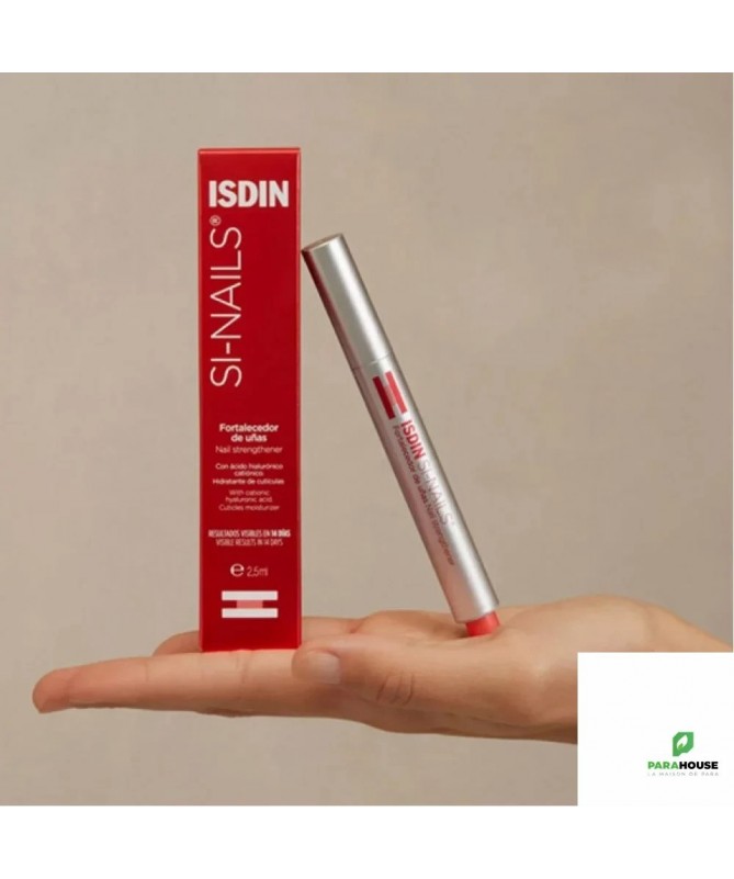 ISDIN SI NAILS STYLO RENFORCEUR DES ONGLES 2.5ML ISDIN SI NAILS STYLO RENFORCEUR DES ONGLES renforce vos ongles grâce à une finition invisible et facile à appliquer. Grâce sa combinaison d'ingrédients actifs, il apporte à l’ongle plus de kératine, plus d’hydratation, plus de silicium et plus de protection. Avec une finition invisible et une application facile, il hydrate et contribue à améliorer la qualité et l'apparence des ongles, favorisant leur croissance et leur résistance. Résultats visibles en 14 jours Grâce à l’acide hyaluronique cationique, notre durcisseur d'ongles Si Nails favorise l’hydratation des cuticules. Composition : Water, Alcohol Denat., PEG-40 Hydrogenated Castor Oil, Butylene Glycol, Acrylates Copolymer, Silanediol Salicylate, Tromethamine, Caprylic/Capric Triglyceride, Hydroxypropyltrimonium Hyaluronate, Triethanolamine, Biosaccharide Gum-2, Pistacia Lentiscus (Mastic) Gum, Propylene Glycol, Phenoxyethanol, Benzyl Alcohol, Methylparaben Conseils d'utilisation : Appliquer ISDIN SI NAILS chaque jour sur des ongles propres et secs. Passer le pinceau humidifié sur tout le bord de l’ongle et de la cuticule. Passer le pinceau avec des mouvements verticaux de l’intérieur vers l’extérieur, en couvrant toute la surface de l’ongle. Si possible, passer le pinceau ISDIN SI NAILS sous l’ongle.