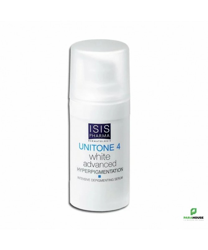 ISIS PHARMA UNITONE Serum Eclaircissant Intensif Grâce à une nouvelle génération d'agents dépigmentant actifs de la plus haute efficacité et d’une tolérance parfaite, UNITONE 4 reveal serum apporte un traitement efficace pour réduire les taches pigmentaires, en seulement quelques semaines. Un extrait de Réglisse le plus pur combiné avec l'Alpha-Arbutin (2%) lutte contre la surproduction de mélanine. L'Acide citrique (6%) exfolie la mélanine préformée à la surface de la peau. Il nettoie la peau avec un effet blanchissant de longue durée. L'Acide ascorbique (2%) améliore la l'éclat de la peau. Il révèle et renouvelle la luminosité de la peau. Sa texture sérum non comédogène est adaptée à tous types de peau même les peaux grasses et garantie une tolérance parfaite. Composition: AQUA (WATER), CITRIC ACID, HYDROXYPROPYL STARCH PHOSPHATE, ALPHA-ARBUTIN, ASCORBYL GLUCOSIDE, AMINOMETHYL PROPANOL, ALCOHOL DENAT., SODIUM HYDROXIDE, DICAPRYLYL CARBONATE, PHENOXYETHANOL, METHYLPARABEN, PROPYLPARABEN, GLYCYRRHIZA GLABRA (LICORICE) ROOT EXTRACT, SODIUM METABISULFITE, ETHYLPARABEN, TOCOPHEROL. Conseils d'Utilisation: Il est recommandé d'Appliquer UNITONE 4 reveal serum 1 à 2 fois par jour sur les zones à traiter. Peut être utilisé le jour. Évitez l’exposition au soleil et protégez-vous avec un soin solaire adaptée durant la journée (Neotone Radiance SPF50+ ou la gamme Uveblock)
