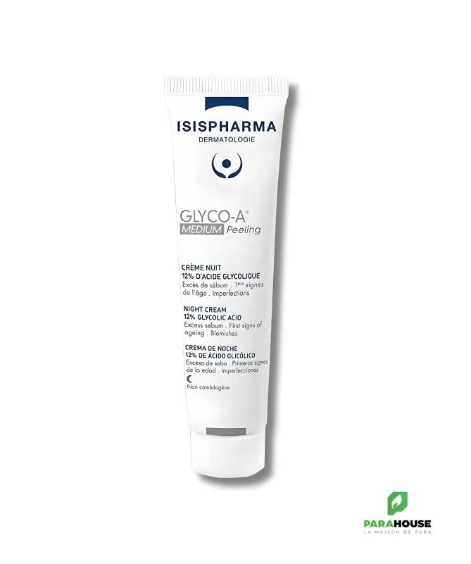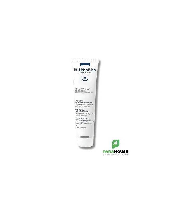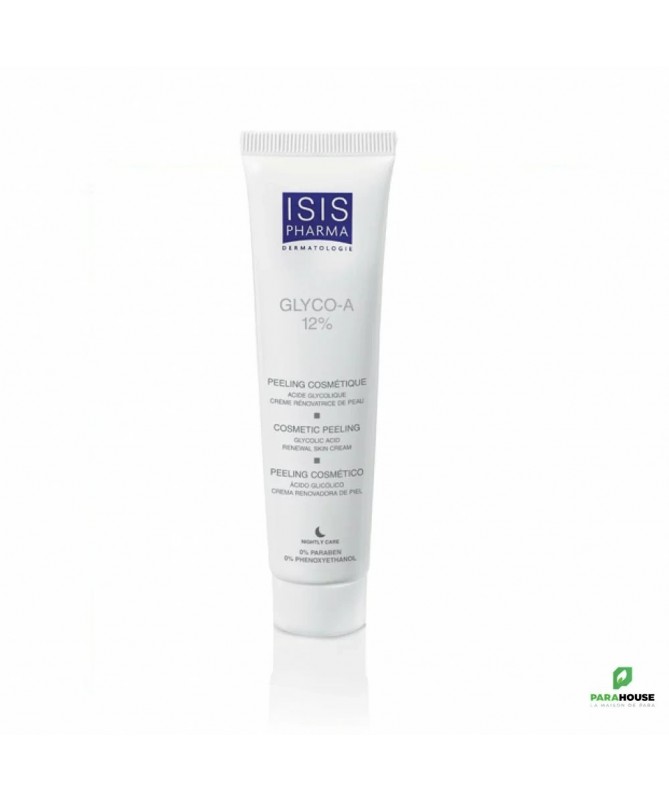 ISISPHARMA GLYCO-A 12% CREME PEELING ISISPHARMA GLYCO A 12% est une crème peeling superficiel qui améliore visiblement l’aspect de votre peau et vous permet de retrouve un teint radieux. Acide glycolique 12% : Stimule l’activité cellulaire, régule la production de sébum, stimule la production d’acide hyaluronique, dynamise la production de collagène et d’élastine et optimise l’hydratation de la couche cornée. Une efficacité prouvée : Réduction de 28 % des rougeurs Diminution du nombre et de la taille des taches, respectivement de 23 et 22 % Réduction des rides et ridules de 18 % Diminution du taux de sébum de 42 % Un grain de peau 33 % plus lisse Composition : AQUA (WATER), GLYCOLIC ACID, CETYL ALCOHOL, PARAFFINUM LIQUIDUM (MINERAL OIL), CETETH-20, STEARETH-20, AMMONIA, PALMITIC ACID, STEARIC ACID Conseils d'utilisation : Appliquez sur le visage 2 à 3 soirs par semaine, pendant 1 mois. Respectez toujours 1 mois de repos si vous souhaitez renouveler la cure. GLYCO A 12% ne convient pas aux peaux sensibles. Il est impératif d’appliquer une très haute protection solaire adaptée pendant la durée du traitement et une semaine après son interruption. Évitez le contact avec les yeux lors de l’application. Nous recommandons l’utilisation du peeling hors période estivale. Ne pas appliquer de peeling dans les 72h suivant une épilation.
