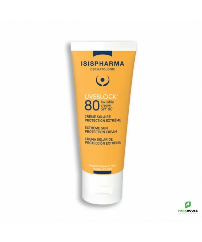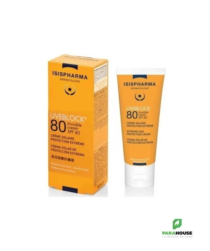 ISISPHARMA UVEBLOCK CREME INVISIBLE SPF80 40ML ISISPHARMA UVEBLOCK CREME INVISIBLE SPF80 a été développée avec une combinaison optimale de filtres offrant une très haute protection contre les UVA et UVB. Il va lutter efficacement contre les dommages cellulaires induits par les infrarouges. Sa formule a été développée pour protéger les peaux sensibles. Il pénètre rapidement et procure une sensation de fraîcheur. Conseils d'utilisation: Il est conseillé d'appliquer la crème invisible ISISPHARMA UVEBLOCK 80 uniformément et généreusement sur le visage et le cou 15 minutes avant l'exposition au soleil. Réappliquez fréquemment, surtout après la baignade, les activités sportives ou les frictions. Evitez tout contact avec les yeux Composition: Formule INCI :AQUA (WATER), ZINC OXIDE, ETHYLHEXYL METHOXYCINNAMATE, OCTOCRYLENE, HYDROGENATED DIDECENE, DIMETHICONE, CETYL ALCOHOL, BUTYL METHOXY-DIBENZOYLMETHANE, TITANIUM DIOXIDE, PROPYLENE GLYCOL, GLYCERYL STEARATE, GLYCERIN, CYCLO-PENTASILOXANE, GLYCERYL DIBEHENATE, PEG-75 STEARATE, CETETH-20, DEXTRIN PALMITATE, TRIBEHENIN, XANTHAN GUM, STEARETH-20, DIAZOLIDINYL UREA, GLYCERYL BEHENATE, TRIETHOXYCAPRYLYLSILANE, DIMETHICONOL, METHYLPARABEN, PROPYLPARABEN, BHT