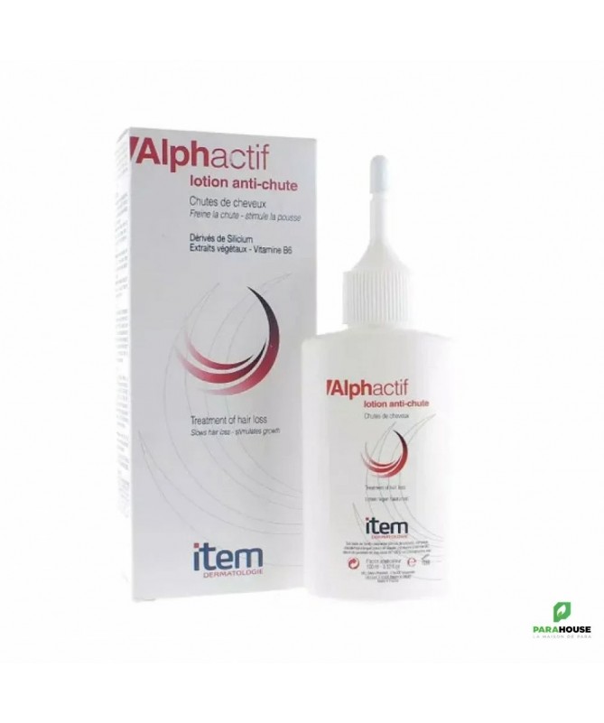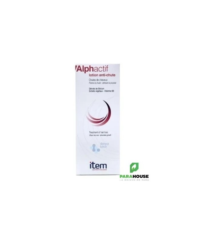 ITEM ALPHACTIF Lotion Anti Chute 100ML ALphactif la lotion Anti Chute permet de freiner la chute et de Stimuler la pousse. Silicium organique. Extraits végétaux. Vitamine B6. Lotion au siliciym organique, à la vitamine B6 et aux extraits végétaux. Freine la chute, stimule la pousse. ITEM ALPHACTIF Lotion Anti Chute est un soin traitant des états alopéciques de l'homme et de la femme. La lotion freine la chute des cheveux et stimule la repousse. Le silicium organique rétablit les échanges cellulaires et active la circulation sanguine, induisant une action stimulante sur la zone germinative du cheveu. La vitamine B6 ou ppyridoxine est essentielle au nimveau du bulbe pilaire pour assurer les transformations organiques des acides aminés soufrés, nécessaires à la vitalité du cheveu. Les extraits végétaux d'origine naturelle stimulent l'irrigation du cuir chevelu, assainissent et fortifient les cheveux à la racine. Efficacité testée en milieu hospitalier sous contrôle dermatologique. Composition : Formule INCI : Aqua, alcohol denat, hydrolyzed soy protein, butylene glycol, allium sativum, silanediol salicylate, dimethysilanol hyaluronate, pyridoxine HCL chlorphenesin, methyl paraben, lactic acid. Conseils d'utilisation En soin d'attaque, utiliser alphactif lotion anti chute tous les jours pendant 4 semaines, puis en entretien 3 fois par semaine. Il est recommandé d'Appliquer raie par raie sur le cuir chevelu sec ou humide à l'aide de l'embout applicateur et masser doucement pour une efficacité accrue. Ne pas rincer. Utiliser le shampooing fortifiant ALPHACTIF pour optimiser l'effet de la lotion.