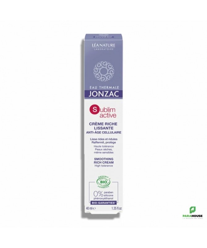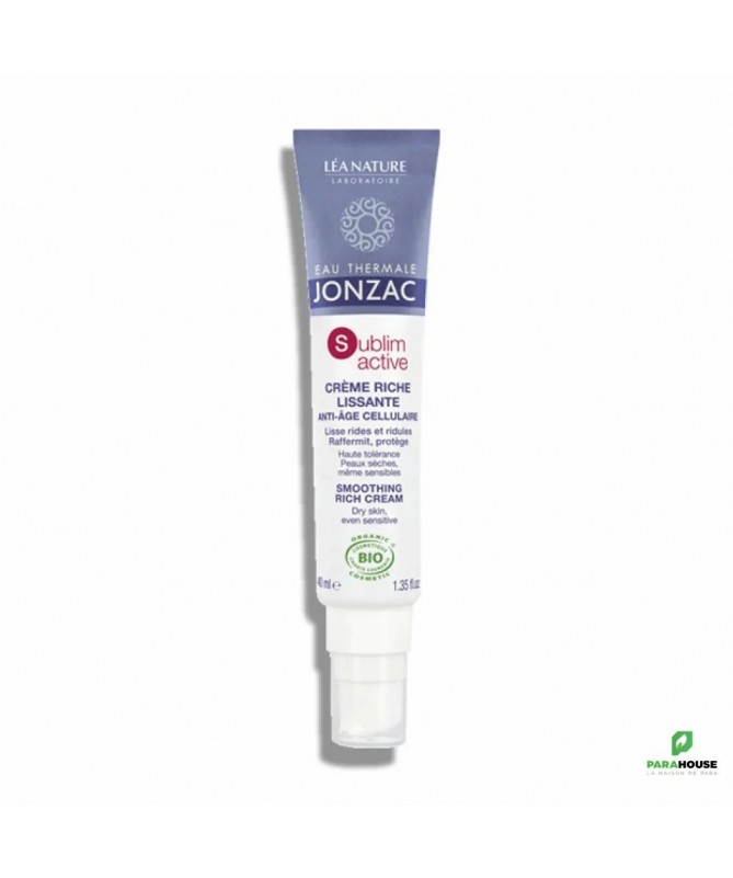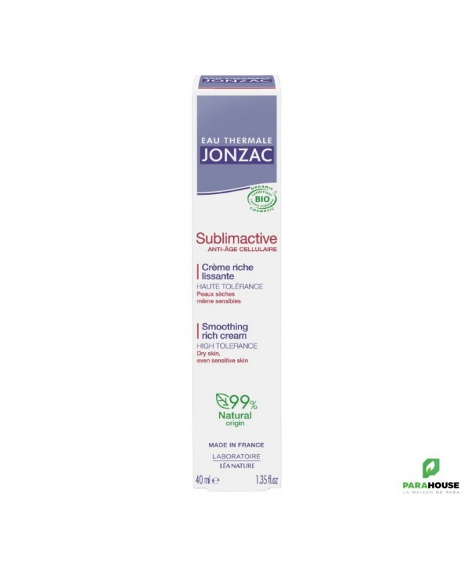JONZAC SUBLIMACTIVE CREME RICHE LISSANTE ANTI AGE 40ML JONZAC SUBLIMACTIVE CREME RICHE ANTI AGE est une crème anti-âge riche et onctueuse qui laisse la peau lisse et rafraîchie. Elle lutte contre le vieillissement cutané, raffermit et prévient les rides et ridules. Formulée avec 25%, Eau thermale de Jonzac, Sel de Dextran reconnu apaisant, Poly-ox® reconnu apaisant, Extrait d'Alaria raffermissante, elle nourrit les peaux sèches et les protège des agressions extérieures. La peau est ainsi sublimée et éclatante de beauté. Peaux sèches, même sensibles Haute tolérance Non comédogène Convient aux vegans Composition : AQUA /WATER/EAU : Eau thermale de Jonzac régénérante, anti-inflammatoire, apaisante, hydratante(1) et eau purifiée ANTHEMIS NOBILIS FLOWER WATER* : Eau florale de camomille bio reconnue adoucissante, issue de l'agriculture biologique française - origine végétale HAMAMELIS VIRGINIANA (WITCH HAZEL) WATER* : Eau florale d'hamamélis tonifiante, issue de l'agriculture biologique française - origine végétale COCOGLYCERIDES : Emollient permettant d'adoucir la peau - origine végétale OCTYLDODECANOL : Emollient permettant d'adoucir la peau - origine végétale GLYCERIN : Humectant permettant de retenir l'eau à la surface de la peau - origine végétale DICAPRYLYL CARBONATE : Emollient permettant d'adoucir la peau - origine végétale CETEARYL OLIVATE : Emulsionnant permettant la formation du soin - origine végétale SORBITAN OLIVATE : Emulsionnant permettant la formation du soin - origine végétale BUTYROSPERMUM PARKII (SHEA) BUTTER* : Beurre de karité bio hydratant(1) et protecteur, issu d'une filière durable et biologique du Burkina Faso - origine végétale BENTONITE : Gélifiant - origine minérale CETEARYL ALCOHOL : Facteur apportant de la consistance au soin - origine végétale SODIUM STEAROYL GLUTAMATE : Emulsionnant permettant la formation du soin - origine végétale CAPRYLIC/CAPRIC TRIGLYCERIDE : Emollient permettant d'adoucir la peau - origine végétale SODIUM LEVULINATE : Stabilisant permettant d'optimiser la conservation du soin - origine végétale GLYCERYL STEARATE CITRATE : Emulsionnant permettant la formation du soin - origine végétale GLYCERYL UNDECYLENATE : Stabilisant permettant d'optimiser la conservation du soin - origine végétale LEUCONOSTOC/RADISH ROOT FERMENT FILTRATE : Stabilisant permettant d'optimiser la conservation du soin - origine biotechnologique garantie sans OGM** OCTYLDODECYL PCA : Emollient permettant d'adoucir la peau - origine végétale PARFUM (FRAGRANCE) : Composition parfumante 100% d'origine naturelle XANTHAN GUM : Gélifiant - origine biotechnologique garantie sans OGM** SODIUM BENZOATE : Conservateur - origine synthétique GLYCERYL CAPRYLATE : Stabilisant permettant d'optimiser la conservation du soin - origine végétale SODIUM DEXTRAN SULFATE : composé de Dextran reconnu apaisant, issu de la biofermentation de sucre de betterave - origine biotechnologique garantie sans OGM** LACTIC ACID : Agent garantissant un pH adapté à la peau - origine biotechnologique garantie sans OGM** PHYTIC ACID : Agent permettant de stabiliser la formule - origine végétale TOCOPHEROL : Vitamine E permettant de stabiliser la formule - origine végétale ALGAE EXTRACT : Extrait d'alaria anti-radicalaire et raffermissant - origine végétale HELIANTHUS ANNUUS (SUNFLOWER) SEED OIL : Huile de tournesol - origine végétale BIOSACCHARIDE GUM-2 : Actif apaisant - origine biotechnologique garantie sans OGM** GLYCINE SOJA (SOYBEAN) OIL : Huile de soja - origine végétale Conseils d'utilisation : Il est conseillé d'appliquer jonzac creme riche lissante anti age cellulaire matin et/ou soir sur le visage et le cou parfaitement nettoyés. La crème riche lissante Sublimactive est une excellente base de maquillage.