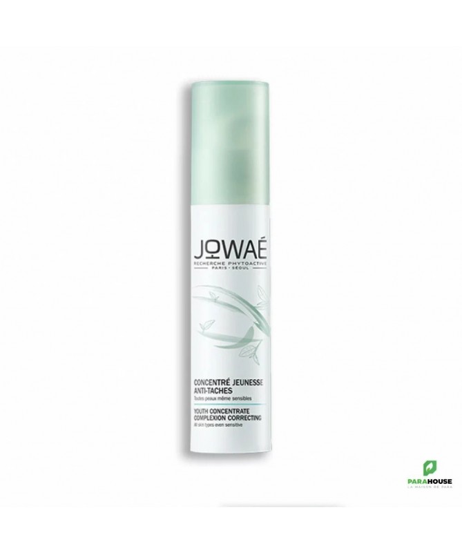 JOWAE CONCENTRE JEUNESSE ANTI TACHES 30ML JOWAE CONCENTRE JEUNESSE ANTI TACHES active la jeunesse, éclaircit, illumine et unifie ton teint. La peau a un aspect radieux et son teint est plus uniforme. Les taches visibles sont visiblement moins apparentes. Jowae Concentré Jeunesse anti-taches réveille immédiatement la vitalité cutanée laissant la peau fraiche, lumineuse et sublimée. Tolérance Non comédogène Active l’efficacité des soins : 91% La peau est plus lisse : 96% Teint dégrisé et plus lumineux, taches moins intenses : 87% Composition : Actifs : - Lumiphénols antioxydants - Thé blanc - Vitamine E - Vitamine B3 INGREDIENTS : AQUA/WATER/EAU. ISODECYL NEOPENTANOATE. GLYCERIN. SQUALANE. NIACINAMIDE. CETEARYL ALCOHOL. SODIUM STEAROYL GLUTAMATE. ALCOHOL DENAT. CAPRYLIC/CAPRIC TRIGLYCERIDE. AMMONIUM ACRYLOYLDIMETHYLTAURATE/VP COPOLYMER. ETHYL LINOLEATE. HEXYLRESORCINOL. PLANTAGO LANCEOLATA LEAF EXTRACT. PARFUM/FRAGRANCE. MICROCRYSTALLINE CELLULOSE. CITRIC ACID. XANTHAN GUM. SODIUM BENZOATE. SODIUM SALICYLATE. TETRASODIUM GLUTAMATE DIACETATE. CELLULOSE GUM. PROPANEDIOL. TOCOPHEROL. SEMPERVIVUM TECTORUM EXTRACT. PANCRATIUM MARITIMUM EXTRACT. CAMELLIA SINENSIS LEAF. SODIUM HYDROXIDE. Conseils d'utilisation : Il est conseillé d'appliquer JOWAE CONCENTRE JEUNESSE ANTI TACHES tous les matins avant le soin quotidien.