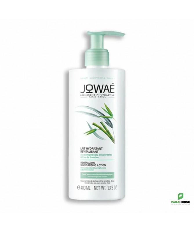 JOWAE LAIT HYDRATANT REVITALISANT 400ML JOWAE LAIT HYDRATANT REVITALISANT est un lait hydratant tonifiant, enrichi en antioxydants, et à base d'eau de bambou. Il protège durablement la peau des agressions externes et assure une totale élasticité. Ce Soin corporel permet d'hydrater intensément la peau pour la protéger du vieillissement cutané et de la sécheresse. La peau reste douce, lumineuse et parfumée longtemps. Tolérance : testée sous contrôle dermatologique Hydrate instantanément : 77% Peau douce et confortable : 86% Habillage rapide après application : 95% Composition : Actifs : - Lumiphénols antioxydants - Eau de bambou - Fleur de soleil - Beurre de karité - Soja INGREDIENTS : AQUA/WATER/EAU. HELIANTHUS ANNUUS (SUNFLOWER) SEED OIL. GLYCERIN. DICAPRYLYL ETHER. CETEARYL ALCOHOL. ETHYLHEXYL STEARATE. BUTYROSPERMUM PARKII (SHEA) BUTTER. CETEARETH-20. POLYGLYCERYL-3 METHYLGLUCOSE DISTEARATE. SODIUM POLYACRYLATE. BAMBUSA VULGARIS WATER. SODIUM BENZOATE. CHLORPHENESIN. PARFUM/FRAGRANCE. XANTHAN GUM. TOCOPHEROL. DISODIUM EDTA. CITRIC ACID. SEMPERVIVUM TECTORUM EXTRACT. SODIUM HYDROXIDE. GLYCINE SOJA (SOYBEAN) OIL. Conseils d'utilisation : Il est recommandé d'appliquer JOWAE LAIT HYDRATANT REVITALISANT matin et soir.