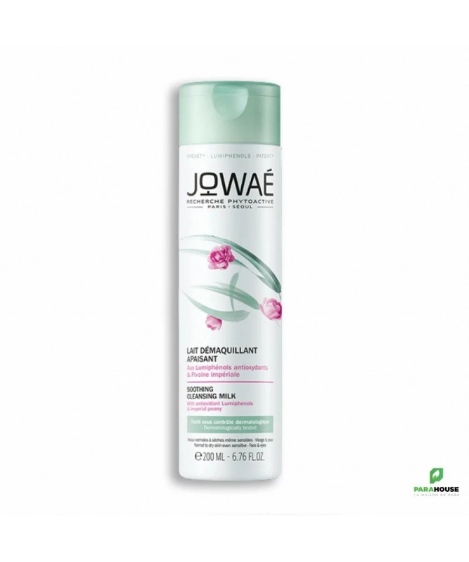 JOWAE LAIT DEMAQUILLANT APAISANT 200ML JOWAE LAIT DEMAQUILLANT APAISANT aux propriétés apaisantes, nourrissante et équilibrantes. Il nettoie, démaquille et préserve du dessèchement cutané. La peau est nette, débarrassée du maquillage et des impuretés. Elle est douce et confortable. Le teint est frais et lumineux. JOWAÉ Lait Démaquillant Apaisant profite de la puissance antioxydante des lumiphénols pour réparer les dégâts oxydants réalisés par le stress et les agressions extérieures quotidiennes. JOWAÉ est également enrichi en Pivoine impériale afin de sublimer l'hydratation de la peau. Ce soin convient aux peaux normales à sèches même sensibles. Visage et yeux. Testée sous contrôle ophtalmologique Élimine en douceur les impuretés et le maquillage, même longue tenue : 100% Préserve du dessèchement cutané : 95% Teint frais et lumineux : 96% Composition : Actifs : - Lumiphénols antioxydants - Pivoine impériale - Fleur de soleil - Jojoba - Glycérine végétale INGREDIENTS : AQUA/WATER/EAU. CAPRYLIC/CAPRIC TRIGLYCERIDE. POLYGLYCERYL-6 DISTEARATE. POLOXAMER 184. PROPANEDIOL. CETEARYL ALCOHOL. GLYCERIN. ETHYLHEXYL STEARATE. ISOSTEARYL ISOSTEARATE. JOJOBA ESTERS. CHLORPHENESIN. PARFUM/FRAGRANCE. SODIUM BENZOATE. ETHYLHEXYLGLYCERIN. XANTHAN GUM. CETYL ALCOHOL. POLYGLYCERYL-3 BEESWAX. TOCOPHEROL. HELIANTHUS ANNUUS (SUNFLOWER) SEED OIL. CITRIC ACID. SEMPERVIVUM TECTORUM EXTRACT. PAEONIA OFFICINALIS FLOWER EXTRACT. SODIUM HYDROXIDE. Conseils d'utilisation : Il est conseillé d'appliquer JOWAE LAIT DEMAQUILLANT APAISANT matin et soir à l’aide d’un coton.