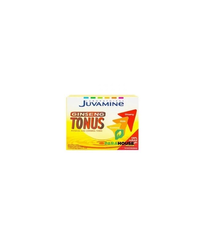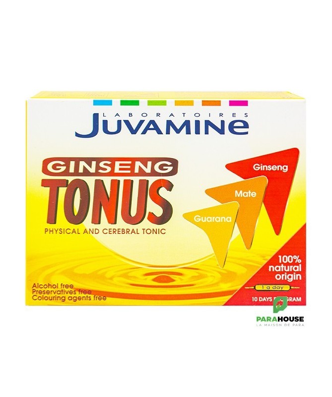 Description :Juvamine Tonus Ginseng 10 Ampoules est un complément alimentaire sous forme d'ampoule buvable à base de plantes.Ce complément alimentaire contient une formule complète aux 3 plantes reconnues pour leurs vertus stimulantes, spécialement développée pour une action spécifique sur le tonus et la vitalité. Le Ginseng et le Guarana sont notamment reconnus pour leurs propriétés stimulantes et tonifiantes. Le Maté est réputé pour son effet tonique sur l'organisme.Conseils d'utilisation :Chaque matin, diluer le contenu d'une ampoule dans un verre d'eau ou de jus de fruits.Programme de 10 jours, à renouveler si nécessaire.Indication : Tonus et vitalité.Composition :Eau Purifiée, Sirop de Fructose, Jus d'Orange Concentré, Extrait de Racine de Ginseng Panax Meyer : 0,6%, Extrait de Feuilles de Maté : 0,67%, Extrait de Graines de Guarana : 1,3%, Arômes d'Orange et de Citron.