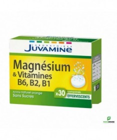 JUVAMINE MAGNESIUM ET VITAMINES B6, B2, B1 JUVAMINE MAGNESIUM ET VITAMINES B6 B2 B1 est nécessaire à la régulation du système nerveux et de la fonction neuromusculaire. Les vitamines B6 B2 B1 sont impliqué dans le bon fonctionnement du cerveau et du système nerveux. Le packet contient 30 comprimés effervescents au goût de sanguine. Il ne contient pas du sucre Conseils d'utilisation : Il est conseillé de dissoudre 1 comprimé effervescent dans un verre d’eau de 200 ml environ. Ne pas prendre à jeun. Programme de 30 jours à renouveler si nécessaire.