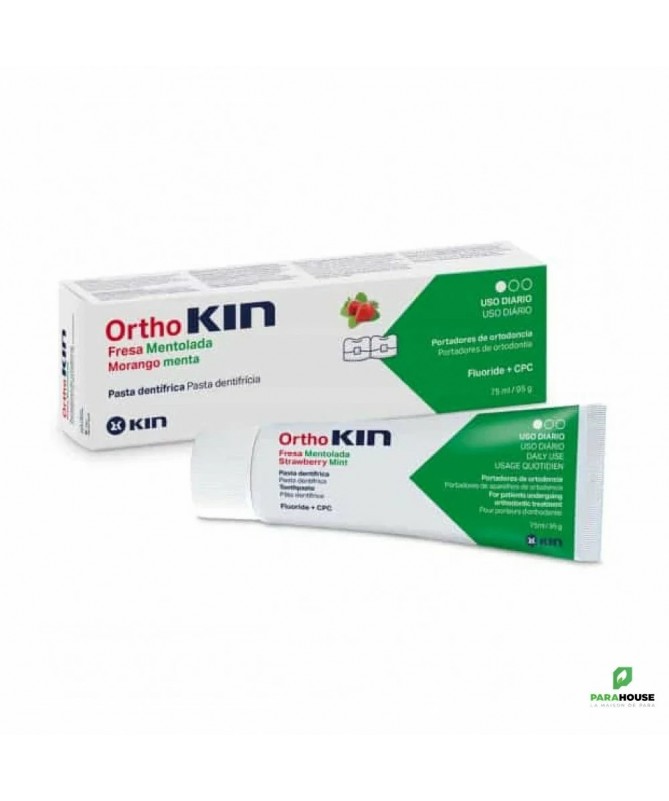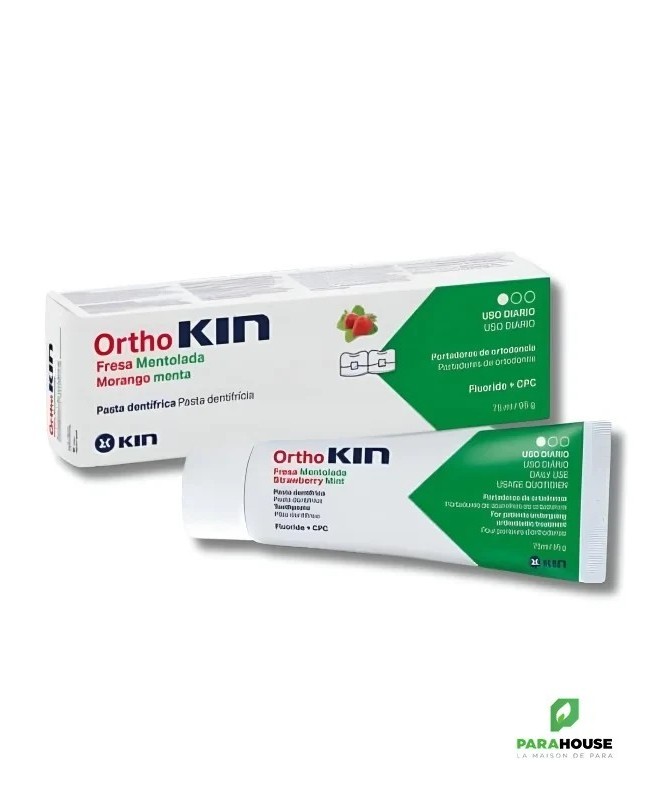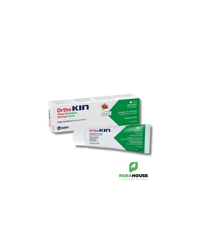 KIN ORTHOKIN PATE DENTIFRICE 75ML OrthoKIN Strawberry Menthol Toothpaste est un dentifrice spécifique pour les personnes qui portent des appareils orthodontiques et qui présentent un risque plus élevé de formation de biofilms dentaires et d'autres troubles bucco-dentaires. En plus de prévenir l'apparition de caries grâce à son effet anti-plaque, il renforce l'émail. Particulièrement adapté à l'usage quotidien des personnes portant des appareils orthodontiques. La composition de ORTHOKIN aide à : Assurer une hygiène bucco-dentaire spécifique pour les porteurs d'appareils orthodontiques. Prévention des caries. Prévention et contrôle du biofilm dentaire. Composition : Fluorure de sodium : 1450 ppm F- Chlorure de cétylpyridinium (CPC) : 0,05 %. Conseils d'utilistion : Brossez-vous les dents pendant 2 à 3 minutes au moins deux fois par jour, de préférence après chaque repas et avant de vous coucher. Convient aux enfants de plus de 6 ans. Ne pas avaler. Sans gluten.