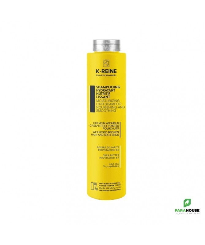 Description :Son mélange est enrichit par le beurre de karité et la provitamine B5 qui revitalisent et renforcent les cheveux affaiblis et cassants, réparent les pointes fourchues et leur donnant souplesse et brillance. Ce produit est recommandé pour les cheveux traité au lissage brésilienConseil d'utilisation :Appliquer sur les cheveux mouillés. masser soigneusement puis rincer abondamment. Répéter l'opération si nécessaire. Pour plus d'efficacité utiliser le masque k-reine anti frizz antistatique après votre shampoing.
