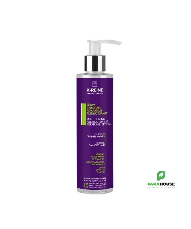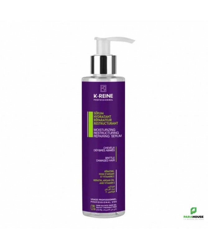 K-REINE SERUM HYDRATANT REPARATEUR RESTUCTURANT 200ML K-REINE SERUM HYDRATANT REPARATEUR RESTUCTURANT Huile D’argan Et Vitamine E 100 ml sans sulfate sans sel pour CHEVEUX DÉFIBRÉS ABIMÉS K-REINE SERUM est conçu pour traiter les cheveux abimés et défibrés, enrichi en kératine et en huile d’argan pour réparer les lésions des cheveux, combler et reconstruire la fibre capillaire, former un film protecteur pour protéger les cheveux agressés et endommagés par les colorations et les brushings répétitifs, Il rééquilibre le taux d'hydratation et apporte douceur, souplesse & brillance. Idéal pour préserver les résultats du lissage brésilien. Hydrate et répare les cheveux abîmés Restaure la santé et la brillance des cheveux Contient de la kératine, de l'huile d'argan et de la vitamine E pour nourrir les cheveux Rend les cheveux plus forts et plus sains Conseils d'utilisation : Après le shampooing et le conditionnement, appliquez une petite quantité de sérum k reine sur les cheveux humides en insistant sur les pointes. Peignez les cheveux pour répartir uniformément le sérum. Ne pas rincer. Utilisez régulièrement pour des résultats optimaux.